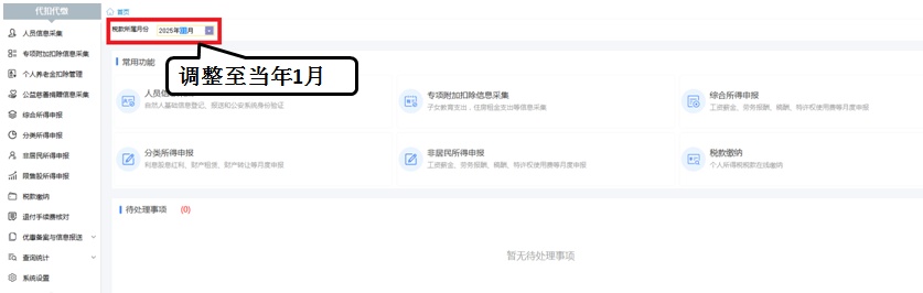 第一步:登录自然人电子税务局(扣缴端),点击【首页】,把税款所属期改为当年的1月份。