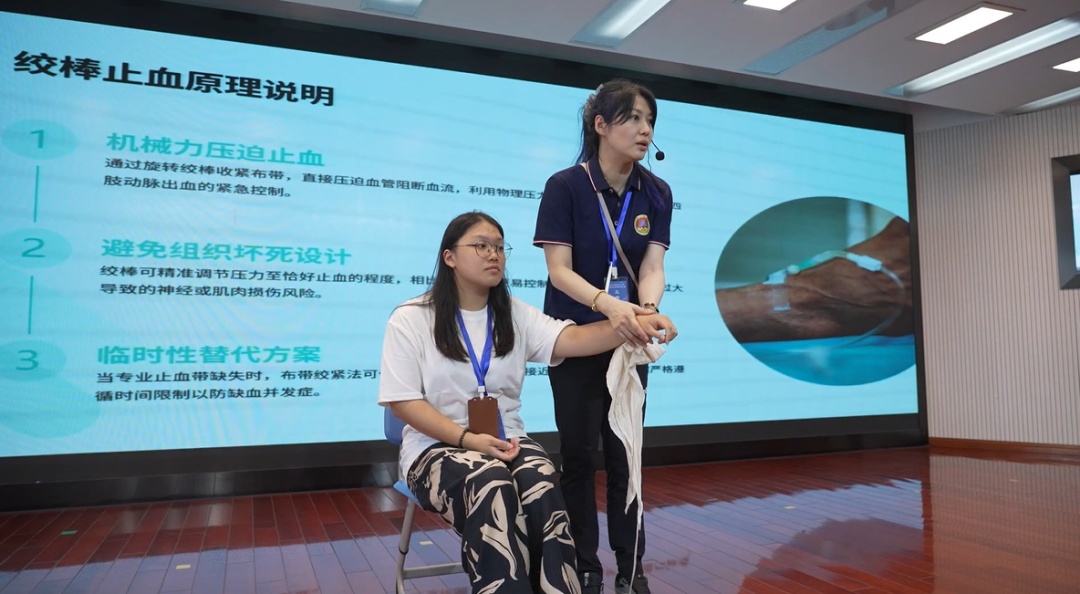 教师专场活动中,全区各中小学、幼儿园约180名教师代表系统学习了人民防空知识与三角巾包扎、逃生绳结等实操技能。上海市二十五中学体育老师胡伟表示,学会急救技能后,能更好地在教学过程中保护孩子们的安全。
