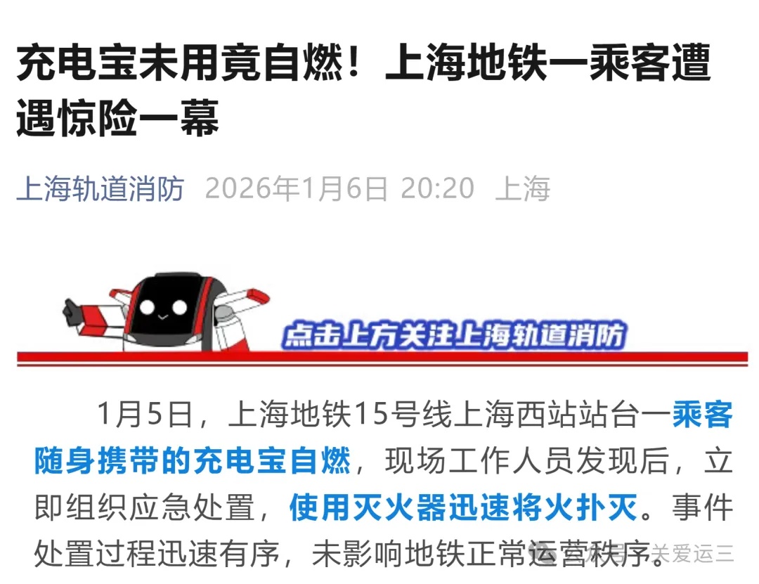 安全提醒:在地铁站,如果发生手机充电宝冒烟自燃,请您第一时间寻找、使用灭火器,并通知工作人员,周围乘客请勿围观。如果发生在列车上,请您第一时间寻找、使用灭火器,并呼叫司机。列车行驶时,请勿擅拉紧急拉手。