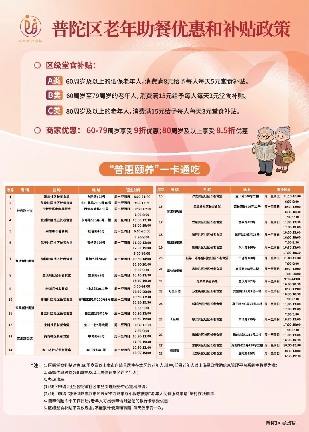 一餐热饭的背后,是体系化的政策支撑。为让老年人得到更多实惠,普陀区近期升级了老年助餐政策,推出“折扣+补贴”双重优惠。(详细优惠点击了解)