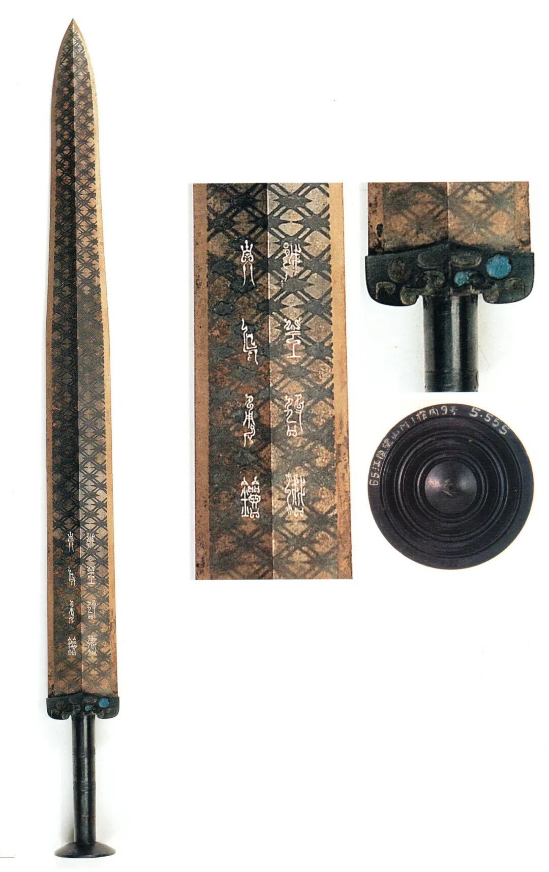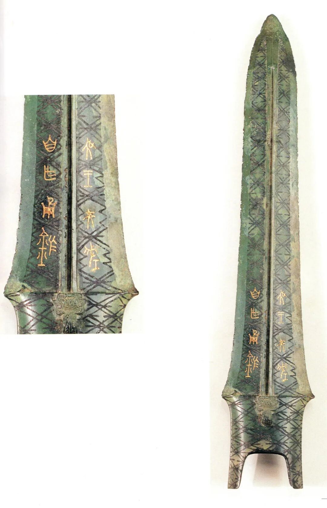 东周铜兵器表面装饰的菱形纹饰,多由双线交叉构成,至锋部菱形逐渐缩小,大多数线条匀称规整,线条交叉处又饰有多种形状的图形,或直线,或菱形,或椭圆,其中最著名的有越王勾践剑和吴王夫差矛。越王勾践剑1965年在原楚国属地湖北江陵楚墓中出土,剑身上有8字鸟篆铭文“越王勾践,自作用剑”。吴王夫差矛1983年在湖北江陵马山5号墓中出土,矛身上有8字错金铭文“吴王夫差,自作用矛”。