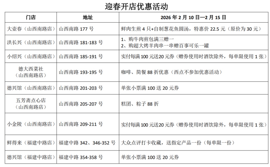 为保障老字号持续经营、守护品牌生命力,此次过渡经营场地由杏花楼集团统筹推进。目前,场地整体加固已完成并通过验收,旗下各老字号店铺内装工作正稳步推进,预计1月底全部完成。届时,鲜得来、德兴馆将入驻福建中路,大壶春、洪长兴、小绍兴、德大、五芳斋、小金陵等品牌则集中落户山西南路(南京东路-天津路)。2月10日—2月15日,相关店家将推出开业迎春促销活动。