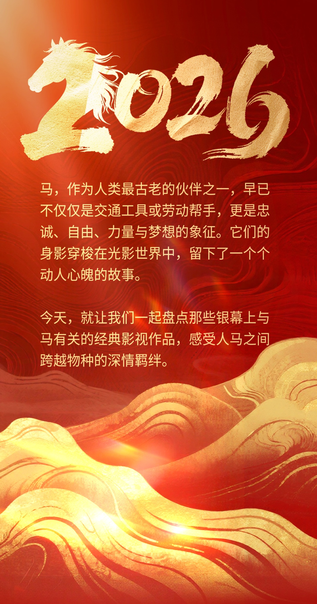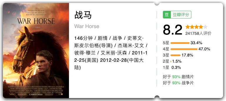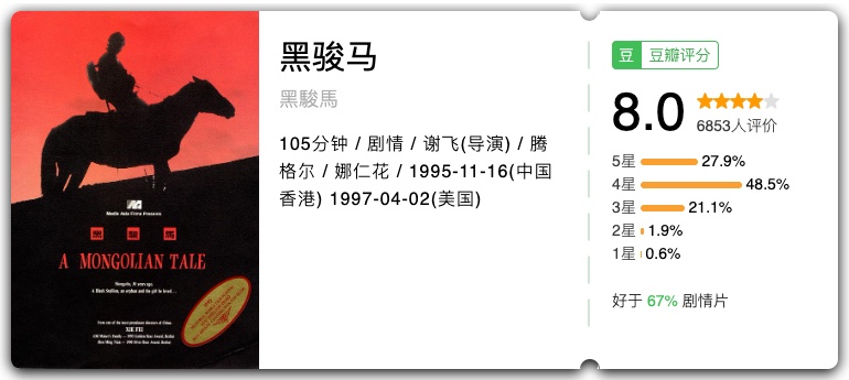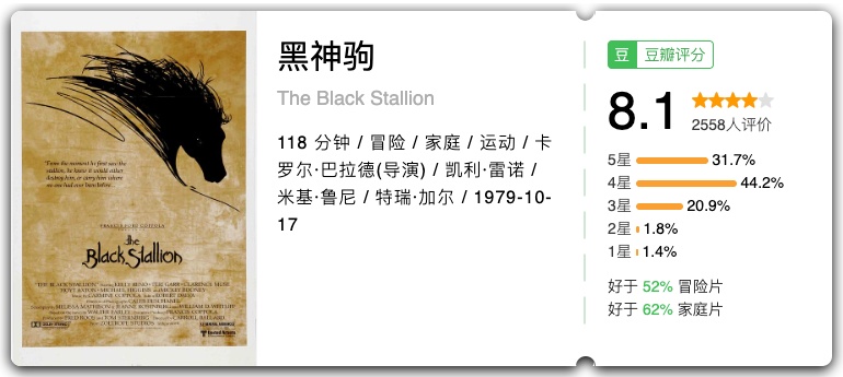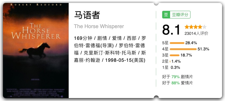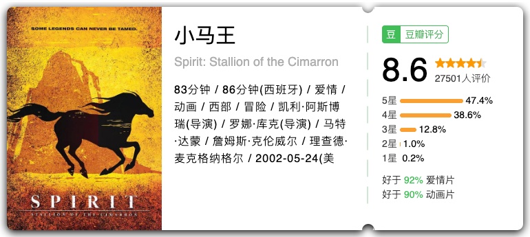 关键词:时代变迁、人性光辉、草原情怀 在这部谢晋执导的经典影片中,马不仅是许灵均在草原上的劳动伙伴,更是他精神的寄托与象征。草原、骏马与善良的牧民,共同构成了许灵均的精神家园,让他在动荡的年代里保持着人性的光辉与对生活的热爱。 关键词:草原文明、成长释怀、黑骏马 影片由谢飞执导,改编自张承志同名小说,以黑骏马为精神与叙事载体,跟随主角白音宝力格的脚步,串联起他与索米娅的草原爱情、离别与归乡。影片借骏马见证草原的变迁与人的成长。 关键词: 一战史诗、生命坚韧、命运羁绊 这部由斯皮尔伯格执导的战争史诗,以一匹名叫乔伊的战马为视角,串联起一战中不同阶层、不同国家的人物命运。从英国乡村的宁静田野,到战火纷飞的欧洲战场,乔伊经历了数次易主,却始终保持着对生命的热爱与对自由的渴望。影片中那匹在铁丝网中挣扎的白马,成为了战争残酷与生命顽强的永恒象征。 关键词:大萧条、逆袭、希望 改编自真实历史事件,讲述了一匹身材矮小、脾气暴躁的赛马“海洋饼干”,与三位同样失意的男人——驯马师、骑师和老板,在经济大萧条时期相互救赎、创造奇迹的故事。海洋饼干的每一次奔跑,都承载着一个民族的希望,它证明了即使身处绝境,只要不放弃,就能创造属于自己的辉煌。 关键词:创伤治愈、沟通、救赎 少女格蕾丝在骑马事故中重伤,她的爱马“朝圣者”也变得狂暴不安。母亲安妮带着女儿和马来到蒙大拿州,寻求神秘的“马语者”汤姆的帮助。汤姆用独特的方式与马沟通,不仅治愈了“朝圣者”,也帮助格蕾丝走出心理阴影,更让安妮重新思考生命的意义。 关键词:自由、抗争、西部风情 这部梦工厂的经典动画,讲述了一匹野性难驯的野马“精灵”,在被美军捕获后,始终不屈服于命运,坚持抗争、追求自由的故事。影片没有让动物开口说话,却通过细腻的动画和布莱恩・亚当斯的经典配乐,完美展现了小马王的骄傲与尊严,以及它对自由的无限向往。 关键词:孤岛奇缘、友谊、成长 一个男孩和一匹阿拉伯骏马在海难后被困孤岛,从最初的陌生恐惧,到逐渐建立起跨越物种的深厚友谊。当他们被救回文明社会后,这匹神秘的黑马展现出惊人的奔跑天赋,成为了赛马场上的传奇。影片中男孩与马在海边奔跑的画面,成为了影史上最经典的人马互动场景之一。 关键词:少女成长、赛马、梦想 少女诗恩与爱马“雷鸣” 一起长大,她们之间有着特殊的默契。诗恩立志成为一名优秀的骑手,带着“雷鸣”参加赛马比赛。影片中诗恩与“雷鸣”相互鼓励、共同成长的故事,让无数观众为之动容。 关键词:马术师、疗愈、童年创伤 这部获奖纪录片记录了传奇马术师巴克・布兰纳曼的故事。他走出了童年被虐待的阴影,将理解与尊重代替惩罚,用温柔的方式与马匹沟通,治愈了无数有心理创伤的马,也帮助了许多人重新认识人马关系。