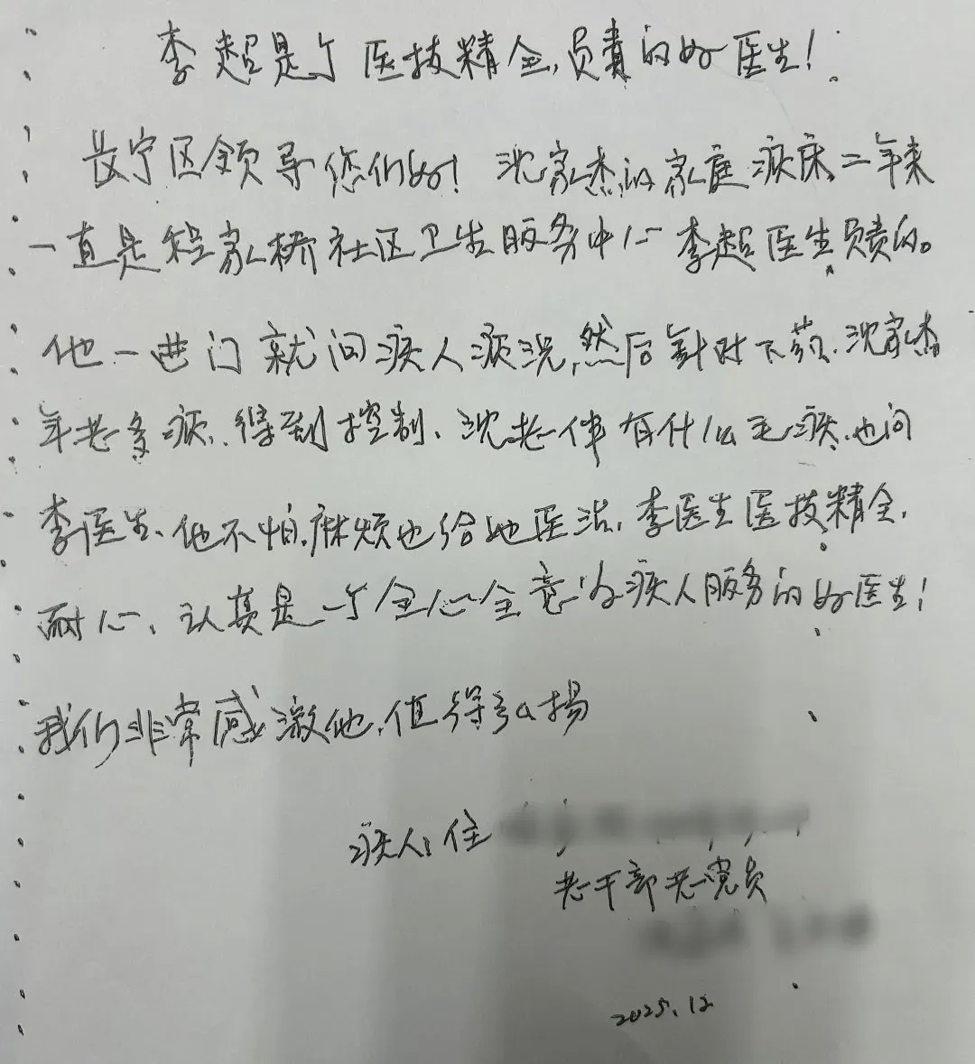 “李医生是一个全心全意为病人服务的好医生……”这是一位92岁的老人手写的表扬信,虽然信中的字迹因为手颤抖而导致字体有些歪斜,但这封信却真情满满,饱含着老人对程家桥街道家庭医生李超的真挚感谢。
