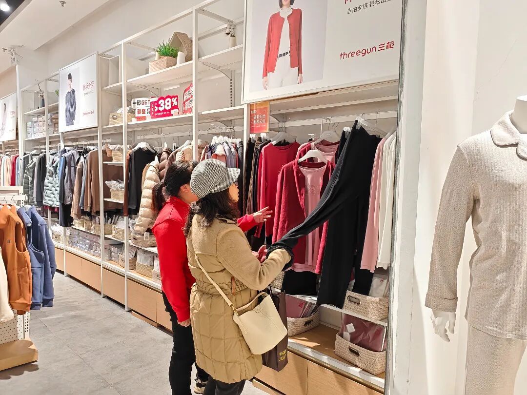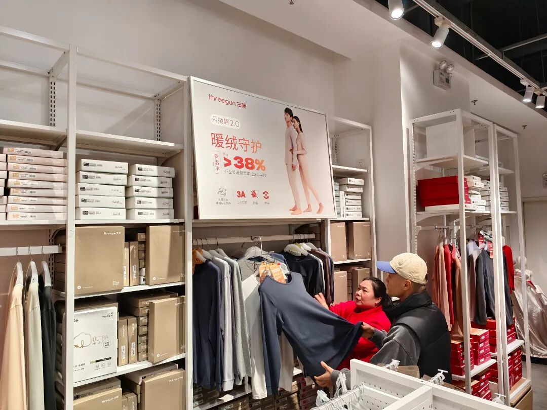 近日,记者在百联曲阳购物中心的三枪专卖店里看到,货架上整齐陈列着各色款式的棉毛衫裤和保暖服饰,不时有顾客驻足挑选。