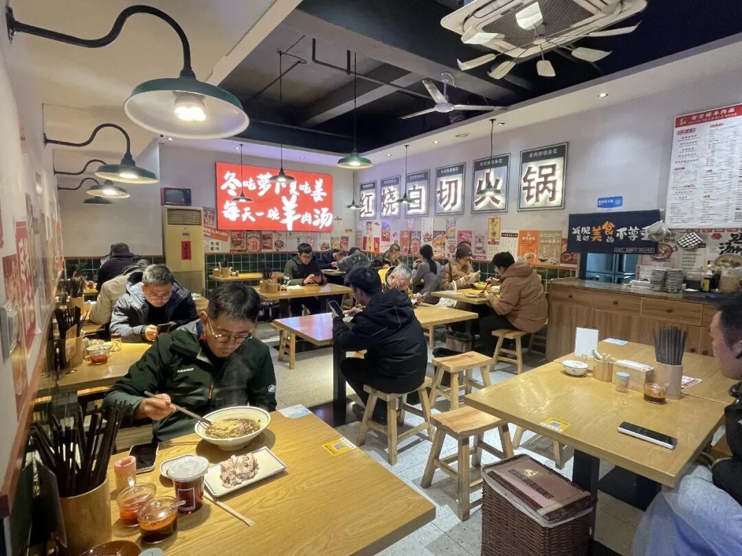 推开木门,时光仿佛倒流至上世纪90年代。墨绿色的复古瓷砖、朴实的木质桌椅、墙上贴满了招牌画报,一股怀旧而亲切的市井气息扑面而来。而所有的焦点,都汇聚在入口处那口大锅里——整锅红烧羊肉在浓郁的汤中微微翻滚,热气与香气交织升腾,堪称视觉与嗅觉的双重震撼。
