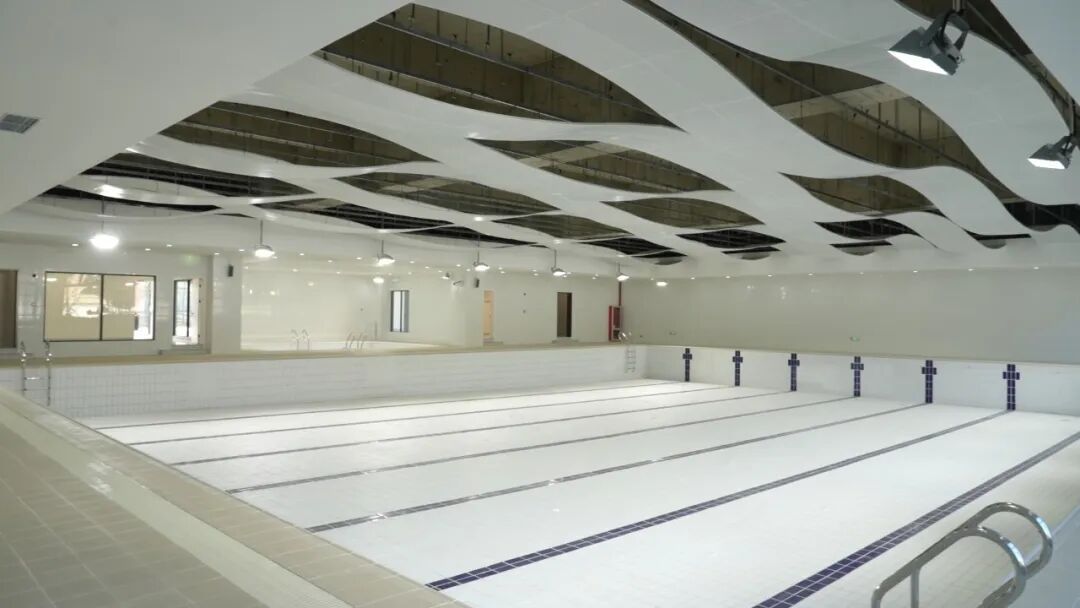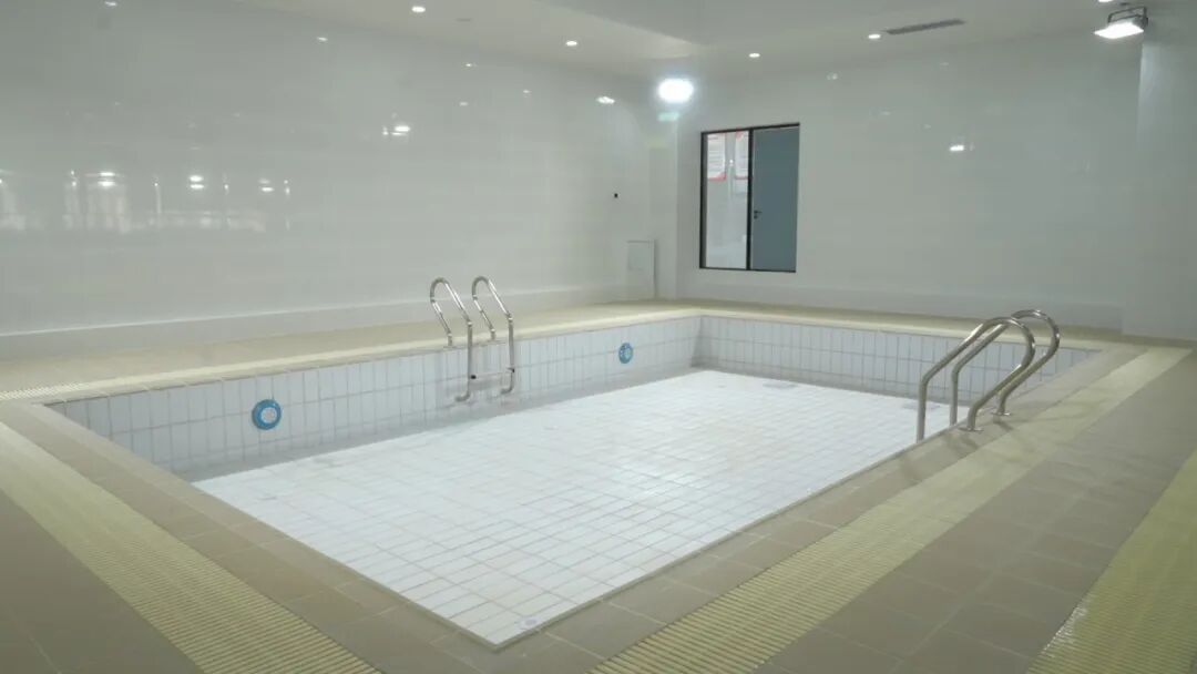 中心总建筑面积达8355平方米,采用地上五层、地下一层设计。步入中心,首先映入眼帘的是宽敞通透的游泳区。据介绍,泳池长25米,拥有七个标准泳道。为方便亲子家庭,还专门设置了独立儿童泳池。
