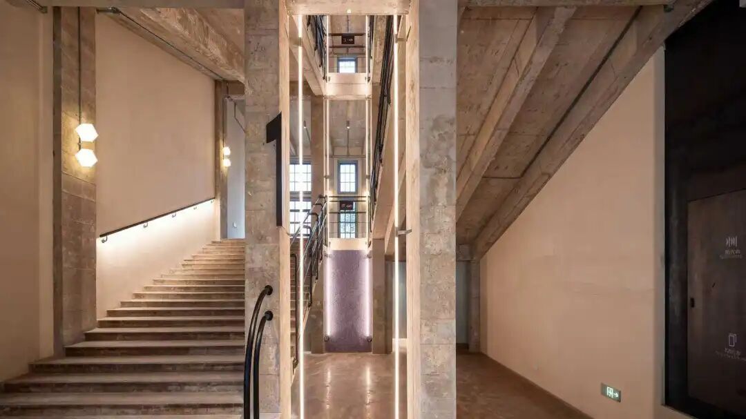 裸露砖墙、混凝土梁柱、老防火铁门,搭配重新切割的采光面,原汁原味的“银行仓库气质”遇上潮流业态,碰撞出独特魅力。C位交错的缓步楼梯,搭配巨大窗户与明暗交织的光影,随手一拍就是工业风大片,精准戳中摄影爱好者审美。