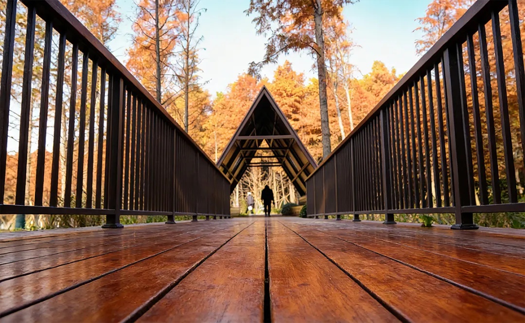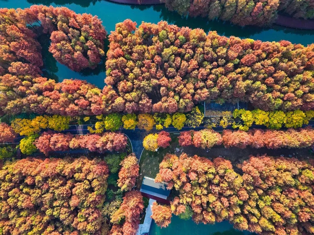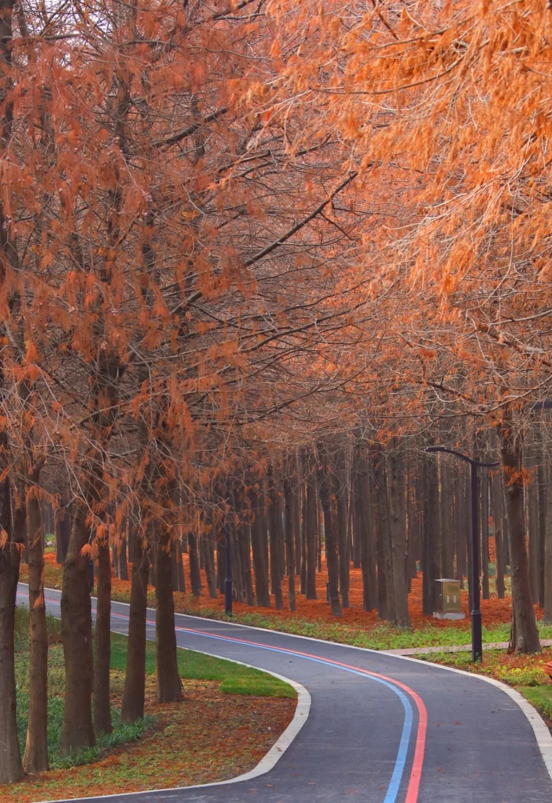 晴天午后是最佳观赏时段,阳光穿透杉叶洒下斑驳金影,橙红到铁锈红的渐变枝叶倒映在水面,氛围感直接拉满。相较于其他热门红杉景点,这里刚开放不久,游客更少,工作日甚至能拍出“无人森林感”。现在落羽杉虽已进入观赏尾声,但枝叶与倒影的韵味依旧在线,再不去拍就又要等一年。