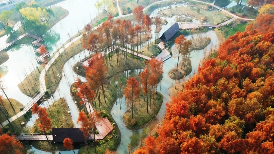 一片如翡翠浮岛般的水上森林静静铺展于碧波之上,2000余株池杉、水杉与落羽杉根植清流,四季轮转间,演绎出翠绿、金黄、绛红的自然画卷。蜿蜒的木质栈道深入林中,既不破坏生态,又能让你沉浸式穿梭其间,近距离感受草木清香与水波荡漾的惬意。