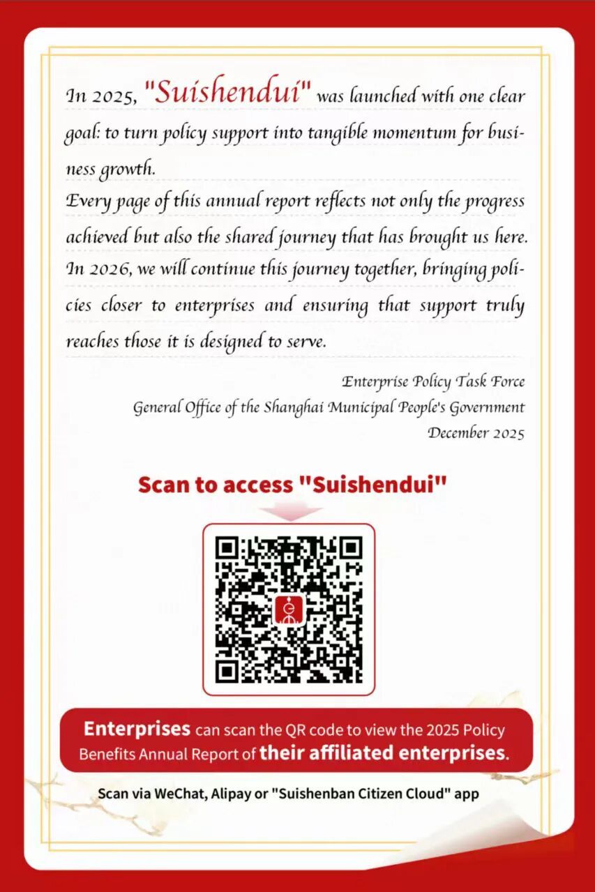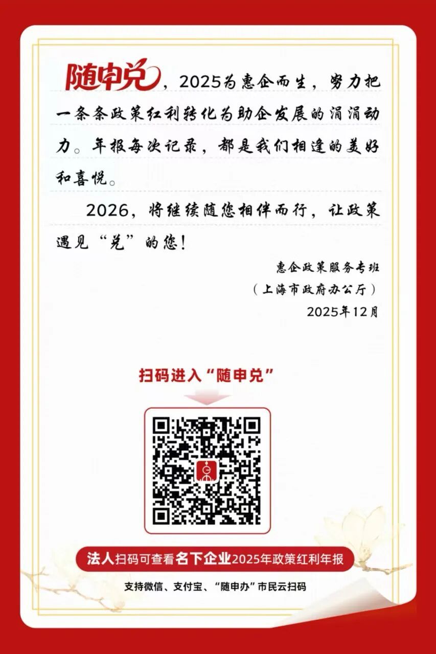 据上海市政府办公厅介绍,2025年,上海市各区、各部门推进企业服务精准高效,优化惠企政策全流程闭环管理,截至12月底,“免申即享”“直达快享”占比分别近50%、90%,财政资金最快24小时兑付到账。市区两级共709个政策项目实现“免申即享”,服务企业超628万次。法人可扫一扫进入“随申兑”查询名下企业政策红利年报。