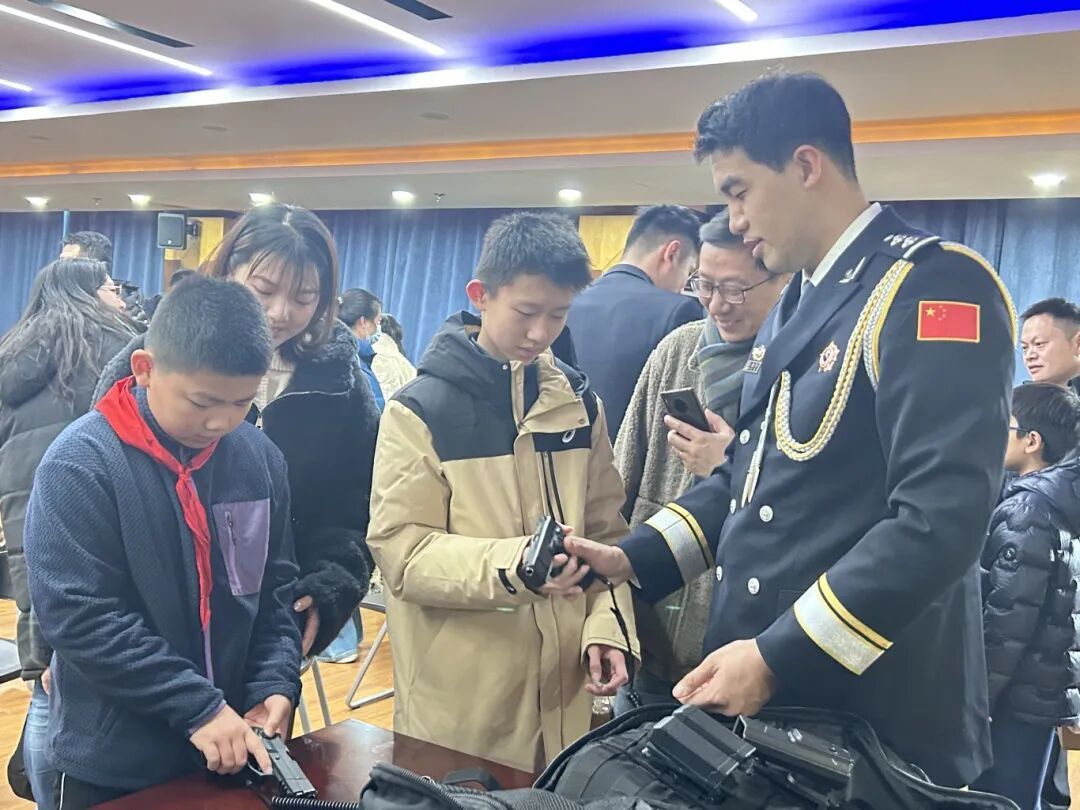 在特警装备展示区,防弹衣、防暴盾、各类警用枪械等平时难得一见的装备整齐陈列。特警队员化身“讲解员”,详细为青少年们介绍装备的功能、用途及在实战中的作用。孩子们好奇地围在装备旁,不时伸手触摸、提问互动。