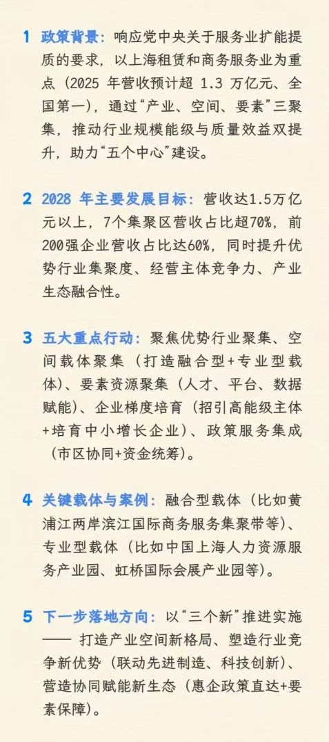 租赁和商务服务业是生产性服务业的重要组成部分,是上海的重点产业。近日,《上海市促进租赁和商务服务业“产业聚集、空间聚集、要素聚集”三年行动计划(2026—2028年)》(点击文末“阅读原文”可查看文件全文)出台,重点实施五大行动,包括优势行业聚集行动、空间载体聚集行动、要素资源聚集行动、企业梯度培育行动和政策服务集成行动等。