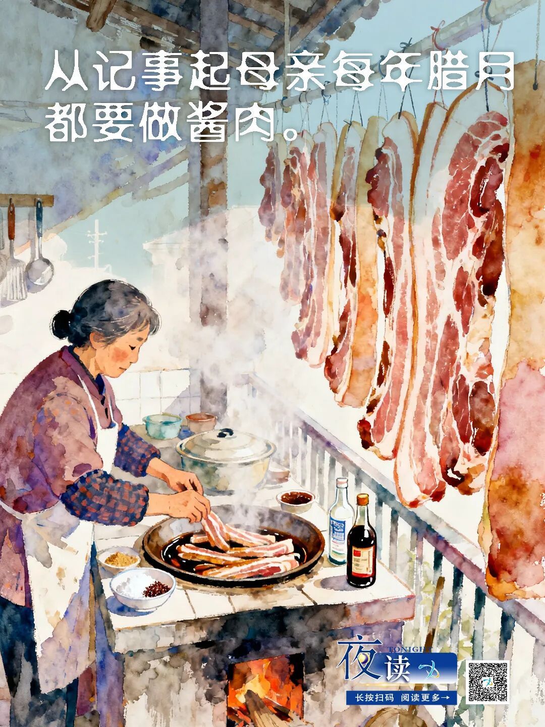 TONIGHT 夜读 我的故乡在浙江,从记事起母亲每年腊月都要做酱肉。 成家后自己第一次做酱肉,先到肉铺买一只猪后腿,请师傅分门别类对猪腿作粗加工,回家后自己再作细加工;完成后切成一条条二三十公分长、一寸见方的肉条;备足老抽、生抽、冰糖与白酒、甜面酱、叉烧酱6种调料,整块冰糖需敲成细颗粒状,白酒必须是瓶盖刚打开的,一股清纯的幽香溢出的那种。 一切准备就绪,可以腌制了。先将肉条平放入一个陶瓷大容器中,铺第一层肉条加老抽、生抽、冰糖、白酒、甜面酱、叉烧酱,老抽与生抽的比例是1:1。第二层操作过程与前类同,层层叠加,肉装入坛子后,酱油必须完全浸没,盖过所有肉条。 腌制完成搁置在阴凉处,每天早晚各翻动一次,确保酱肉腌制均匀,三四天即可晾出。用针线穿进肉条打结,将一根根酱肉穿进晾衣竿,在阳台上晾一晚,沥去酱肉表层酱油汁。 第二天挂在朝北窗外,任凭寒冬腊月西北风呼呼地吹着。第一次做酱肉考虑不周,只想着延长酱肉保存期,让西北风白昼黑夜连轴整整吹了一周,酱肉被吹得硬邦邦完全风干才收起,待蒸熟后咀嚼起来干干硬硬的,吃着肉渣,宣告失败。 次年作了改进,风吹二三天,手摸着酱肉外表已干,捏着里面柔软有弹性就可收藏,试着蒸熟尝尝,口感相当不错,就是母亲做的那酱肉味道。从此每年连做两次醬肉,部分送给父母及弟弟、妹妹品尝。余下的酱肉存放在冰箱的冷冻室,保存一年,口感依旧。 尽管如此,我依然不满足,总觉得仍有改进之处,思来想去,觉得酱肉整个制作过程已毫无挑剔,追根溯源关键还在于原材料——因猪腿纯精肉不够嫩,所以吃着有点柴。 但究竟猪什么部位肉最鲜嫩,做酱肉更合适? 当时我是一无所知,尚无头绪。 一次不经意间与朋友聊起做酱肉之事,问起为何我做的酱肉吃着肉质总有点柴,朋友告诉我这是用猪腿肉所致,只需换成梅花肉,做成的酱肉一定鲜嫩。我是第一次听说还有梅花肉这一说,立即上网查了相关资料得知:梅花肉、里脊肉、五花肉的肉质都比腿肉鲜嫩,于是决定试着用这三种肉同时做酱肉,比较后优中选优。 投稿可发至zfk@yptimes.cn