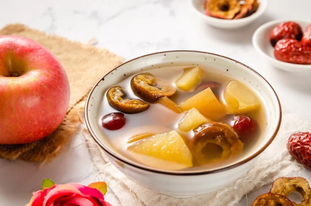 做法:取苹果1个,干百合20克,红枣4颗,枸杞10克,加水煮。