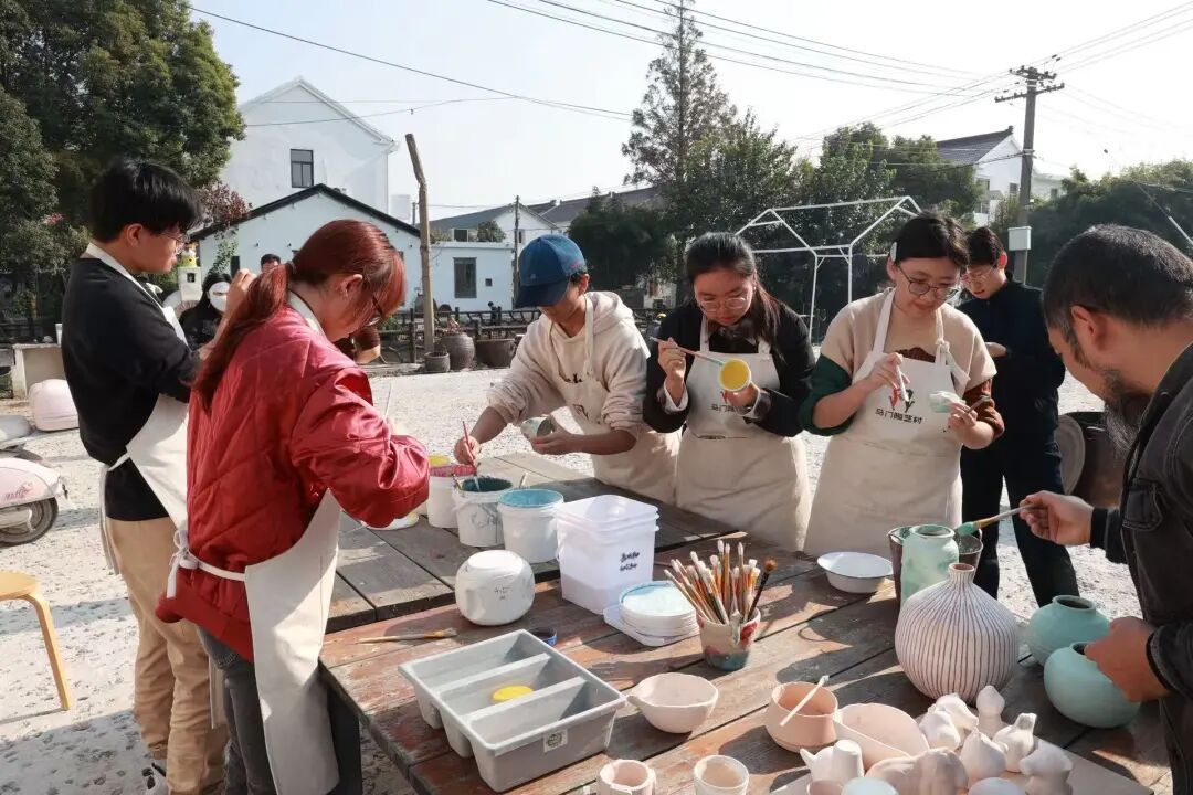 在村里的支持下,高艺峰和几位艺术家好友从改造闲置空间着手。村里的旧仓库最先被活化利用,在完好保留乡村风貌与空间肌理的基础上,改造为共享创作中心,并配备柴窑、坑窑、乐烧等烧制方式,形成了不同于城市工作室的氛围。不仅吸引了游客、爱好者、专业人士前来体验与创作,也成为了上海高校、中小学开展美育与陶艺教学的实践基地。