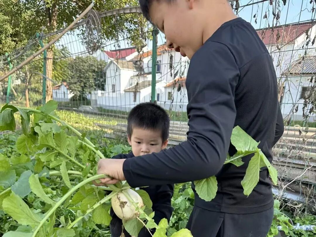 翟天宁夫妇的两个孩子在菜地里拔萝卜