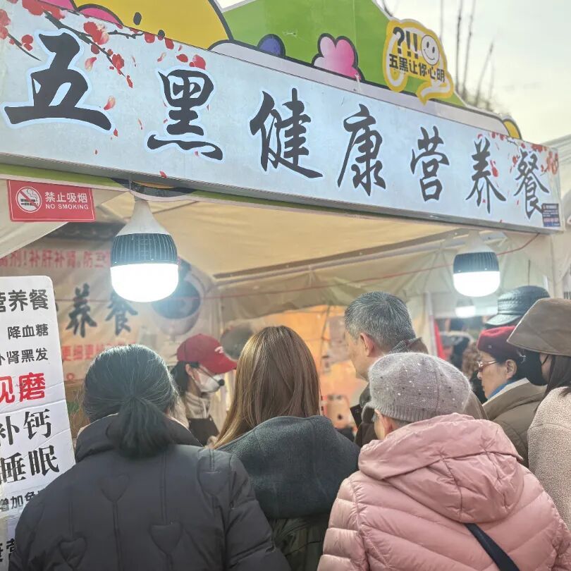 今年的年货还紧跟健康潮流,低盐、养生类产品成了不少市民的新选择。在一家现磨养生粉摊位前,摊主正在为顾客打磨“五黑养生粉”:“我们这儿都是真材实料、现打现磨,纯天然健康绿色食品,不添加蔗糖和防腐剂。”