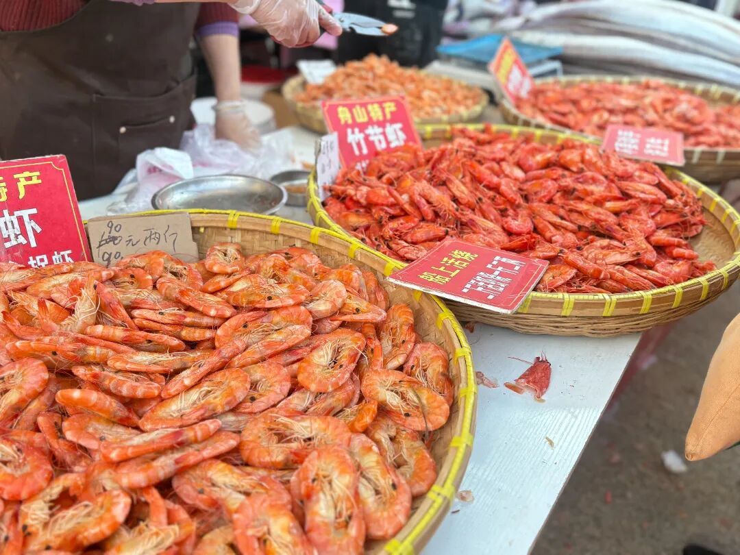 不远处的海鲜摊位更是鲜气十足。摊主拿起鳗鱼干热情介绍道:“我们舟山沈家门的海鲜全是自产自销的,鳗鱼都是刚捕捞上来活腌的,鲜香得很。”