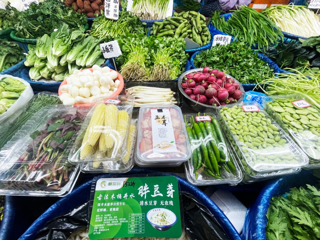 肉食盛宴后,几缕清鲜蔬菜是解腻的“收官”妙笔。市场里,专攻“精品菜”的2家摊位,深深拿捏住了顾客的胃。