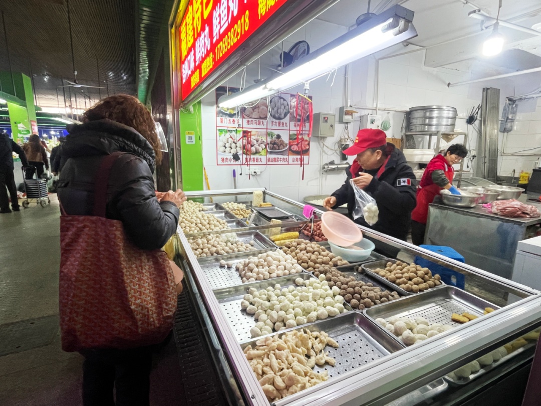摊位上红底黄字“福建特色纯手工美食”赫然醒目,各种口味的鲜肉丸、鲜鱼丸、猪肉发菜丸、手打墨鱼丸、福州肉燕、台湾肉肠琳琅满目,其中最大的鲜鱼丸直径可达5、6厘米。