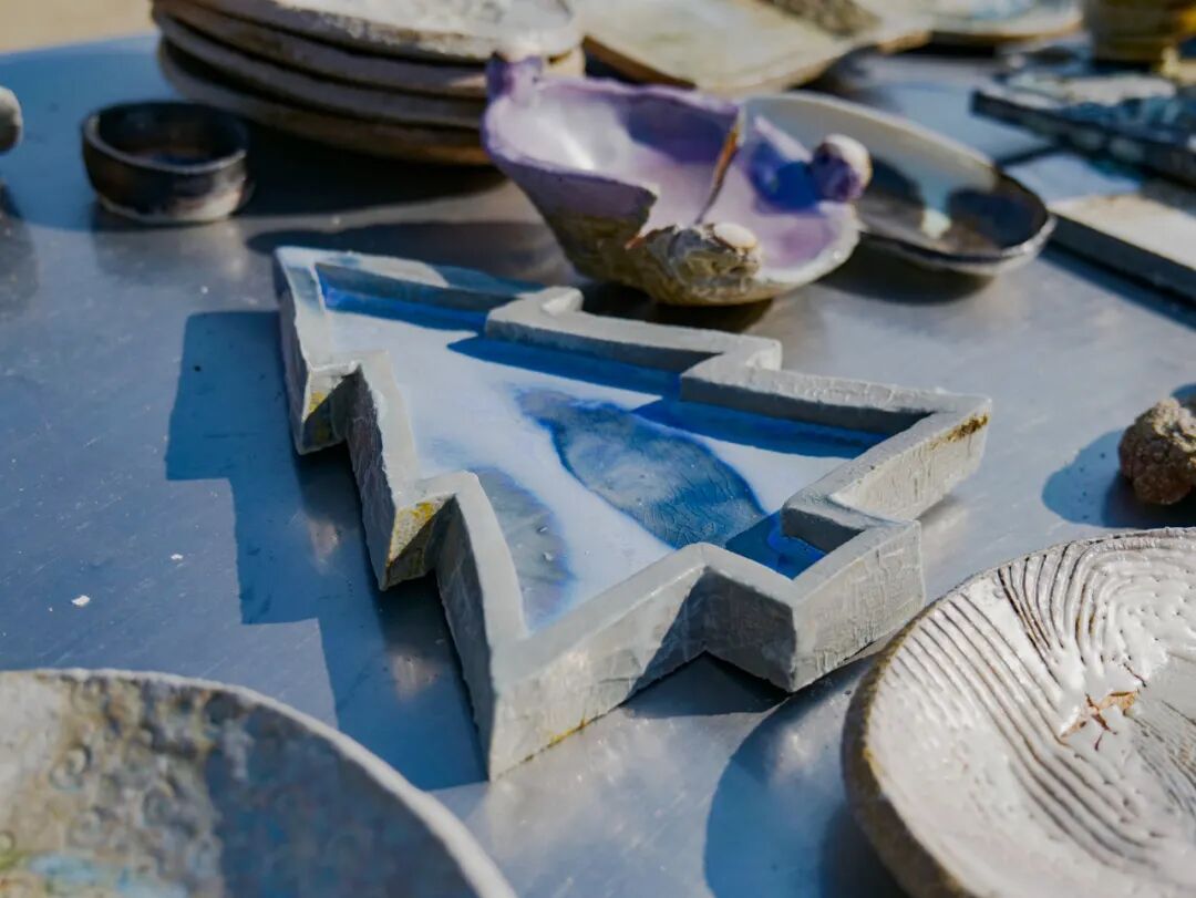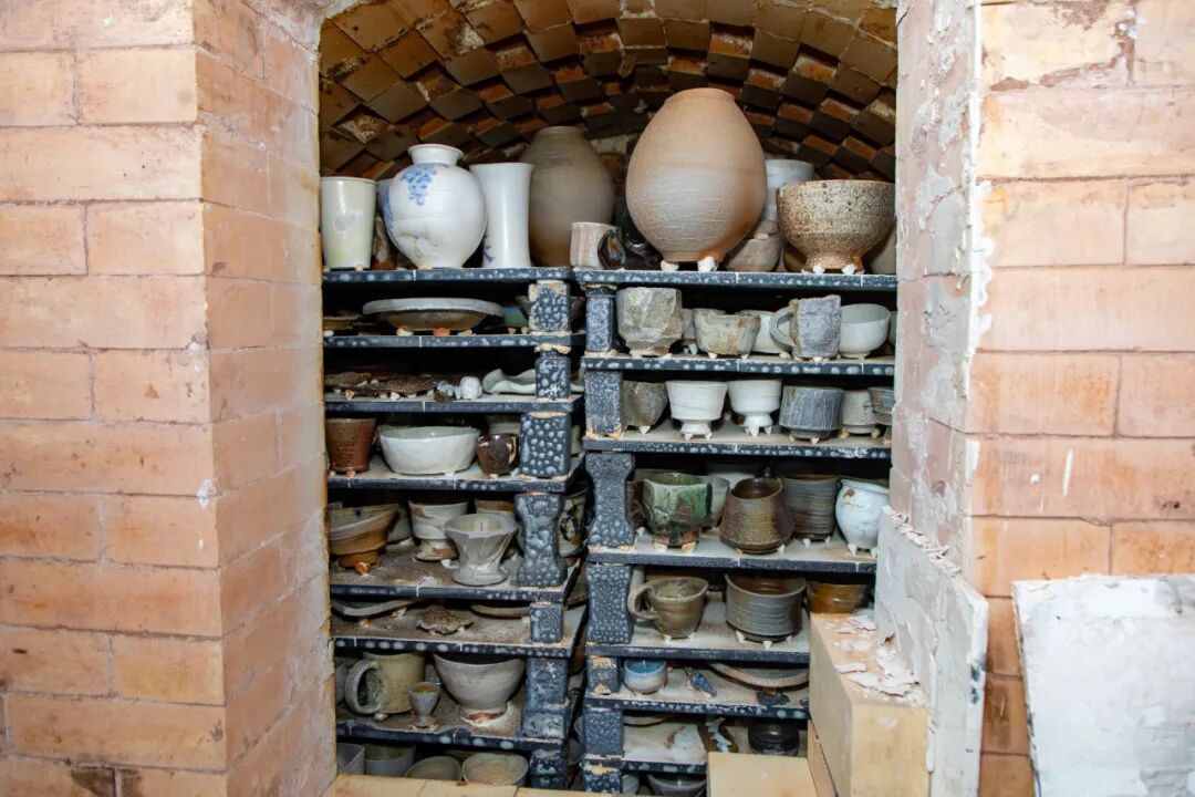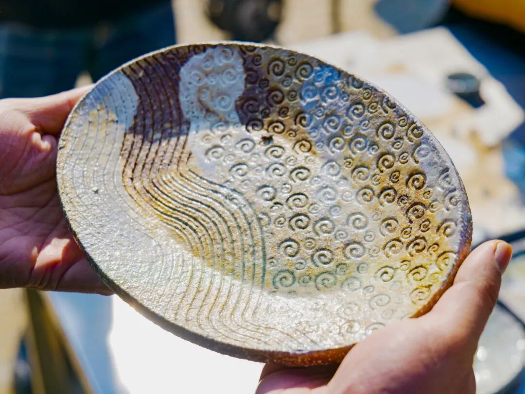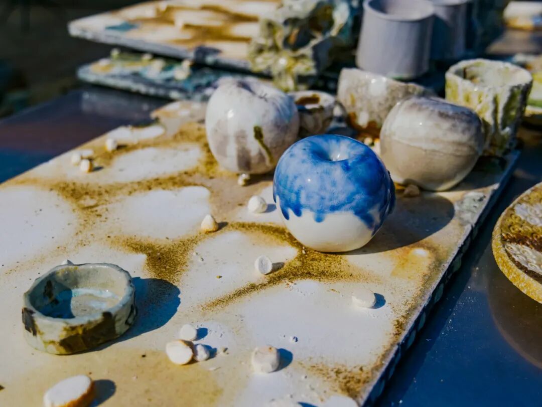 这些陶瓷作品由多位奉贤本土艺术家和陶艺爱好者制作。经过四天三夜的高温柴烧后,它们有的釉色温润如玉,带着火焰流淌的痕迹;有的布满自然落灰形成的独特肌理,仿佛藏着星空与晚霞。每一道纹路都独一无二,是火的笔触、土的肌理,更是时光的印记。