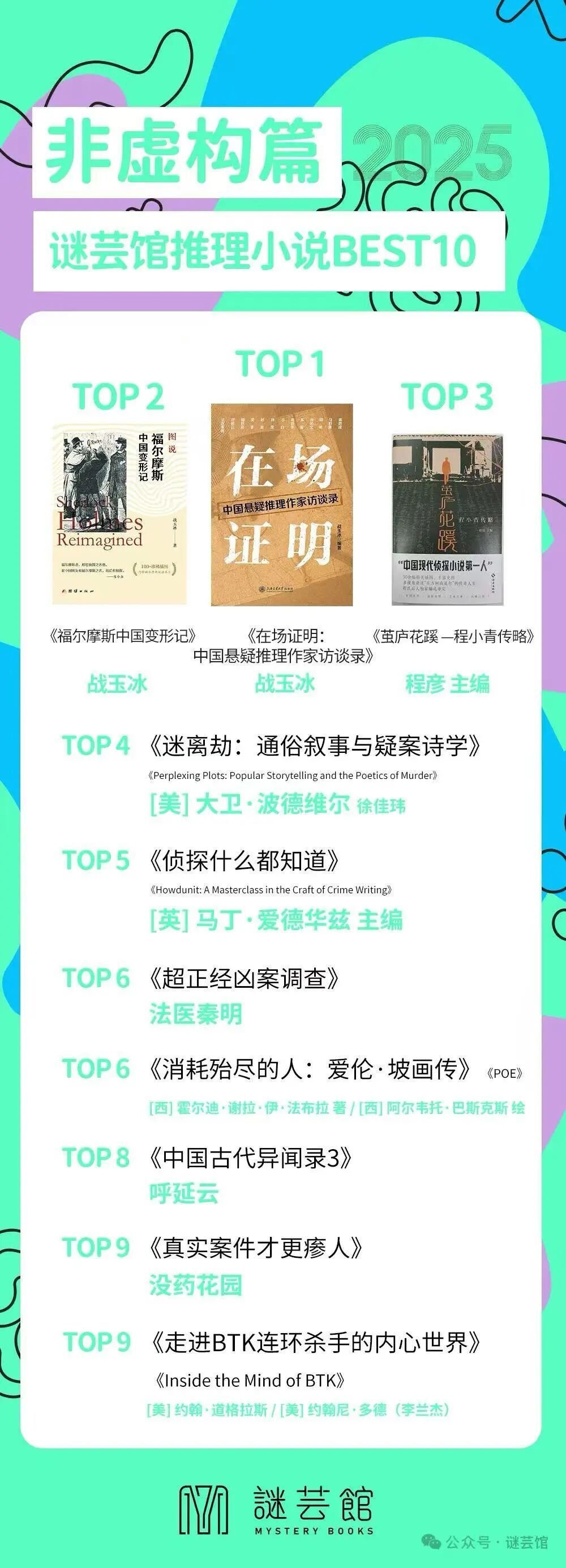 非虚构篇榜单则聚焦于推理研究与真实案件。战玉冰教授《在场证明:中国悬疑推理作家访谈录》与《福尔摩斯中国变形记》分获非虚构篇冠亚军,为读者提供学术视角下的推理文学解读。法医秦明《超正经凶案调查》、“没药花园”《真实案件才更瘆人》等作品,则从真实案件切入,深入探讨罪案与社会、人性的复杂关联。