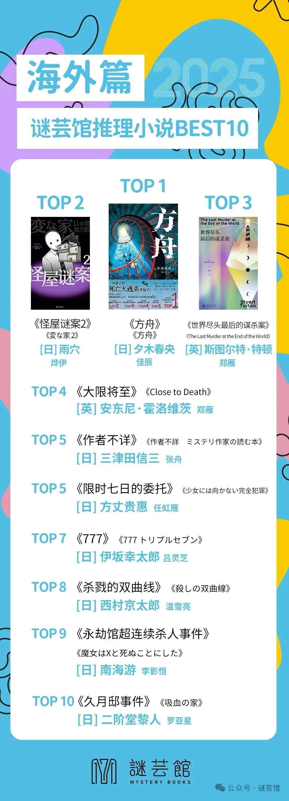 海外篇榜单则呈现了国际推理文学的多元面貌。夕木春央《方舟》荣登海外篇榜首;雨穴《怪屋谜案2》与斯图尔特·特顿《世界尽头最后的谋杀案》紧随其后。榜单囊括三津田信三、方丈贵惠等新本格代表作家,亦收录伊坂幸太郎等风格独具的作品,满足了读者对不同流派的阅读需求。