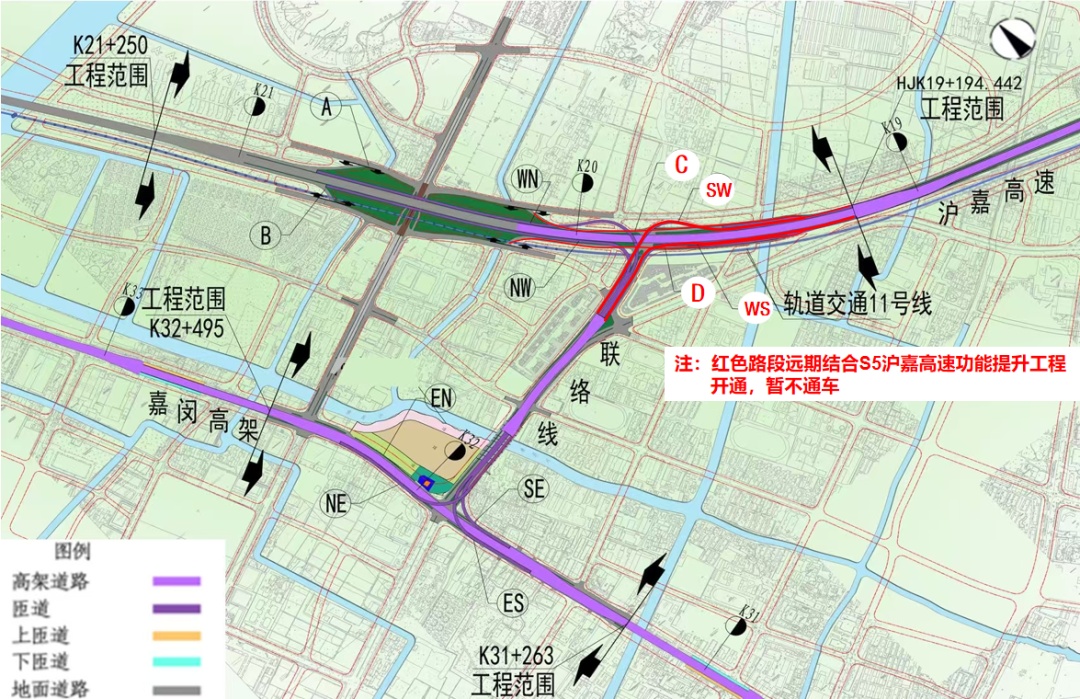 沪嘉—嘉闵联络线位于嘉定区南翔镇,衔接嘉闵高架与沪嘉高速,对于市、区两级的骨架路网完善,及实现跨方式一体衔接的快速联系具有十分重要的意义。建成通车后,进一步完善西北区域骨干路网,均衡路网交通流量;进一步强化沪嘉高速作为嘉定区与中心城之间的市域交通快速通道作用,支撑嘉定新城综合交通体系建设。