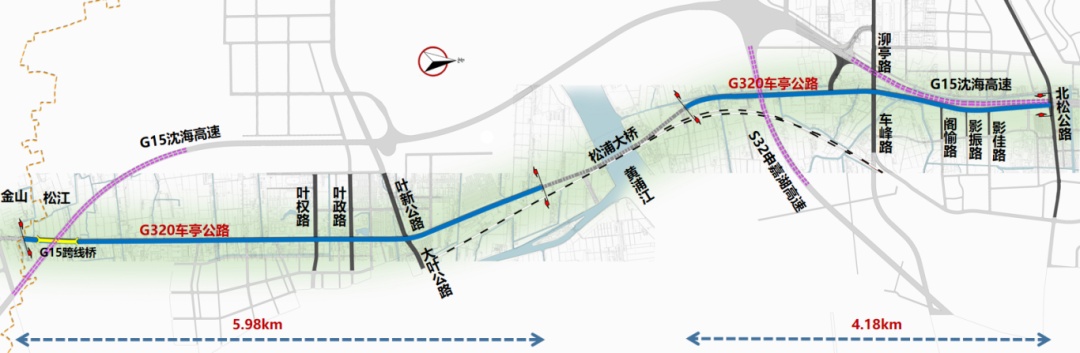 G320公路(松江金山区界—北松公路)改建工程(简称G320公路松江段),于2025年12月22日正式建成并开放双向6车道通车。
