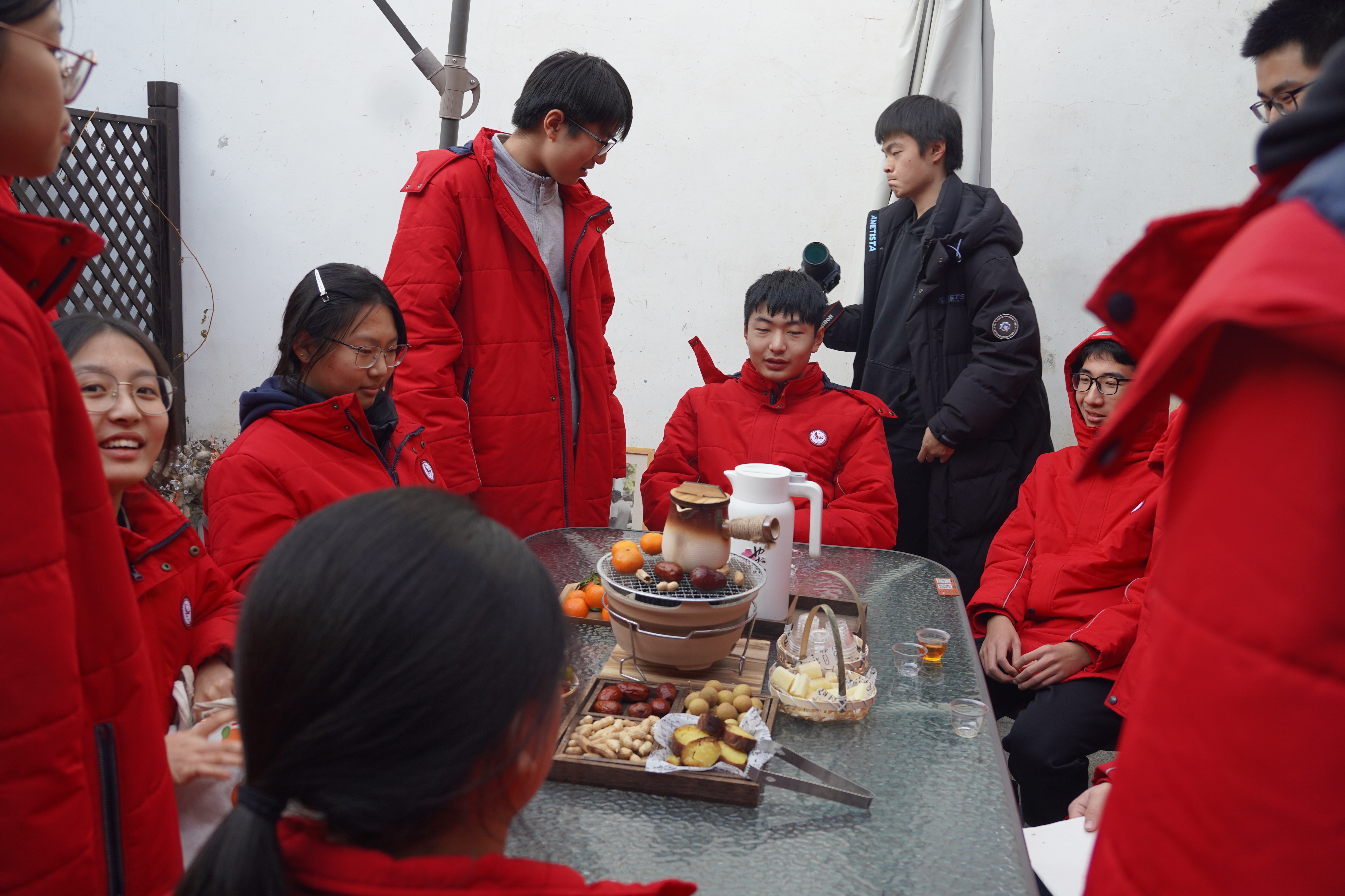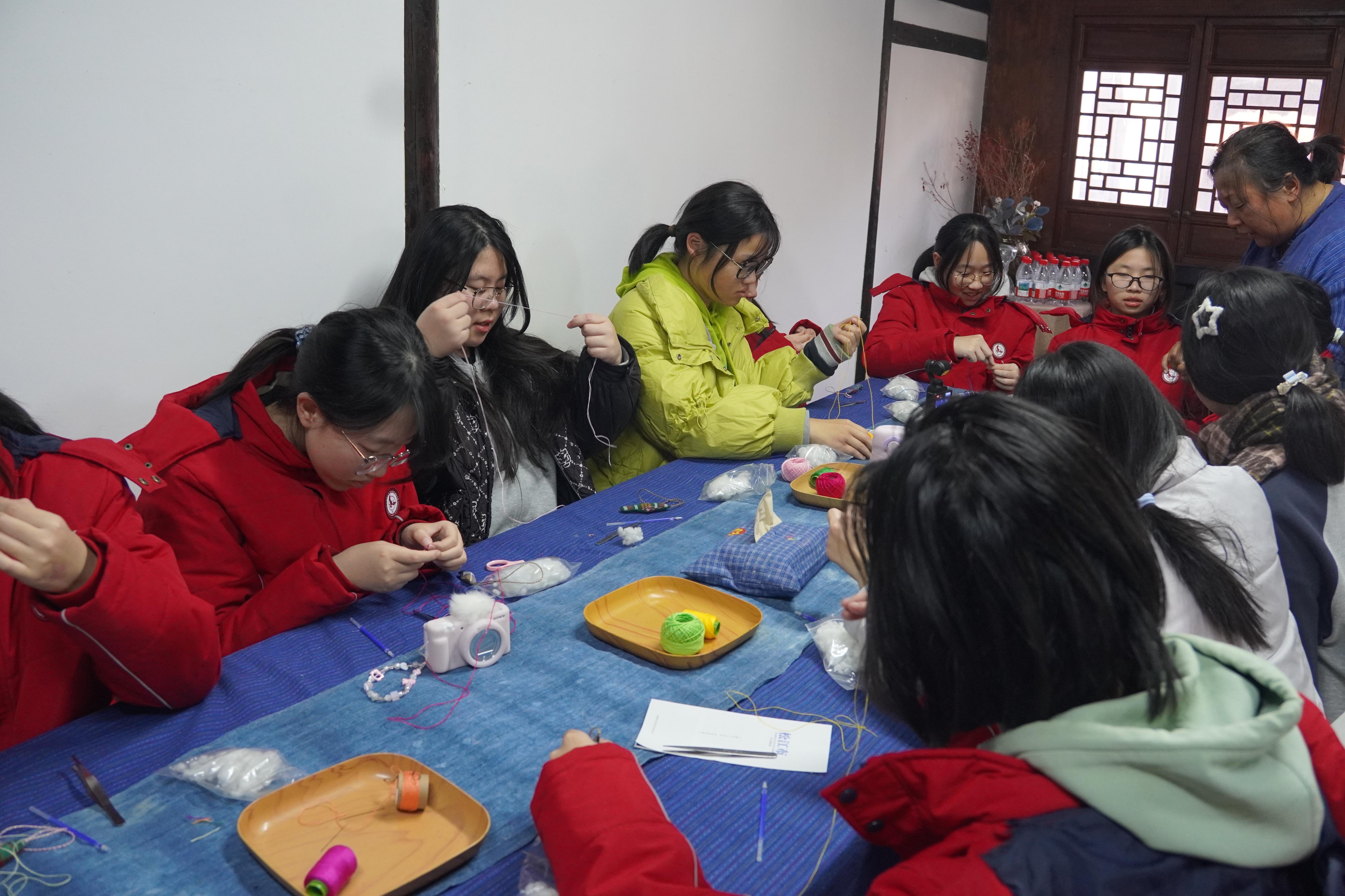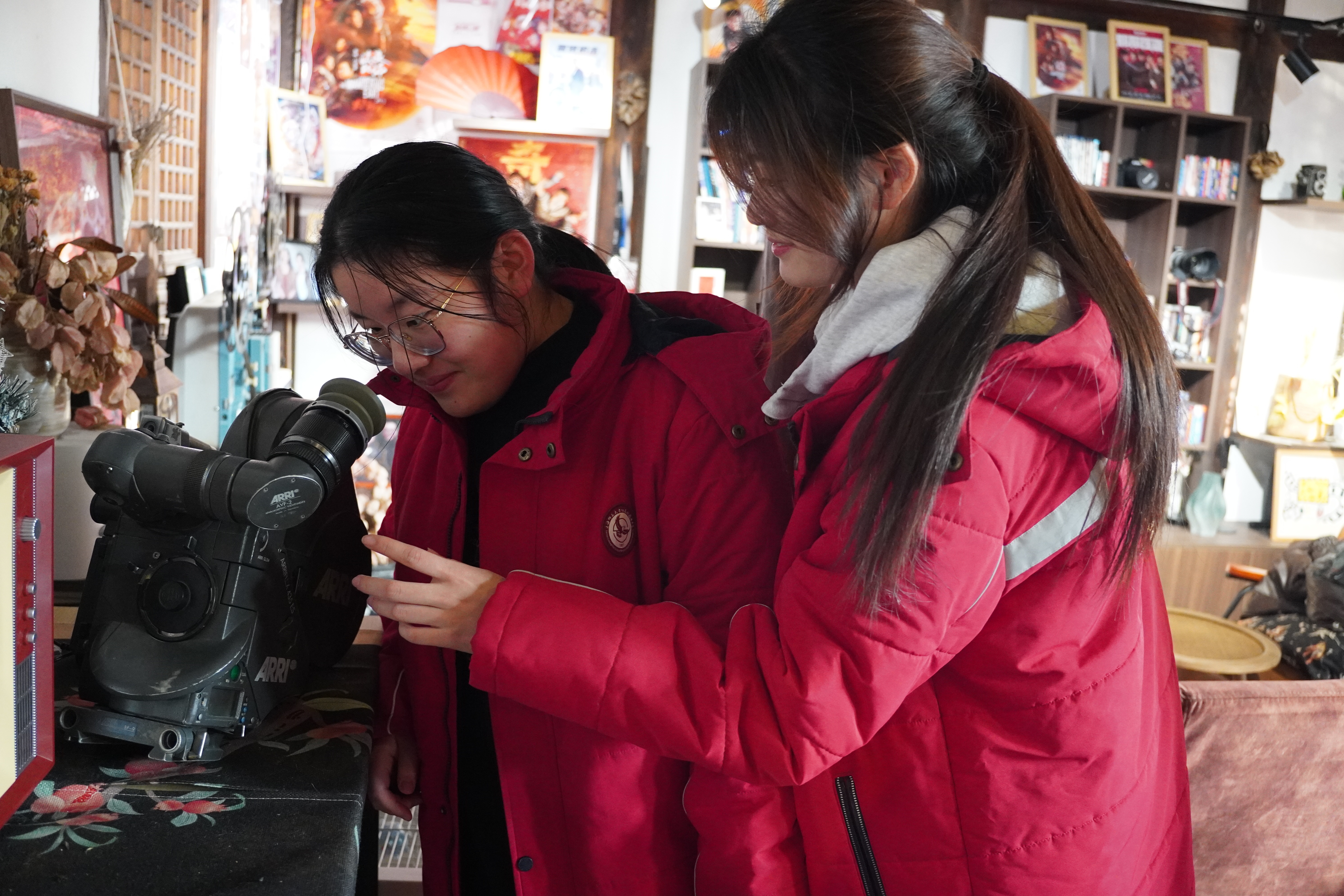 在对面的松江布展示馆,店主为学生们讲解了手工布各类纹样的寓意,并现场教学,指导大家缝制布艺玩偶。在也棠电影艺术空间,老式录像机、放映机不再是陌生的古董,而是成为理解技术革新与艺术传承的生动教材。店主深入浅出地讲解了从胶片到数码的影像演变史。学生们还分组体验了时下流行的“围炉煮茶”。“没想到今天的实践课这么惬意,希望以后在家里,我也能经常和爸爸妈妈围坐在一起喝茶聊天。”高一(10)班学生林子祺高兴地说。