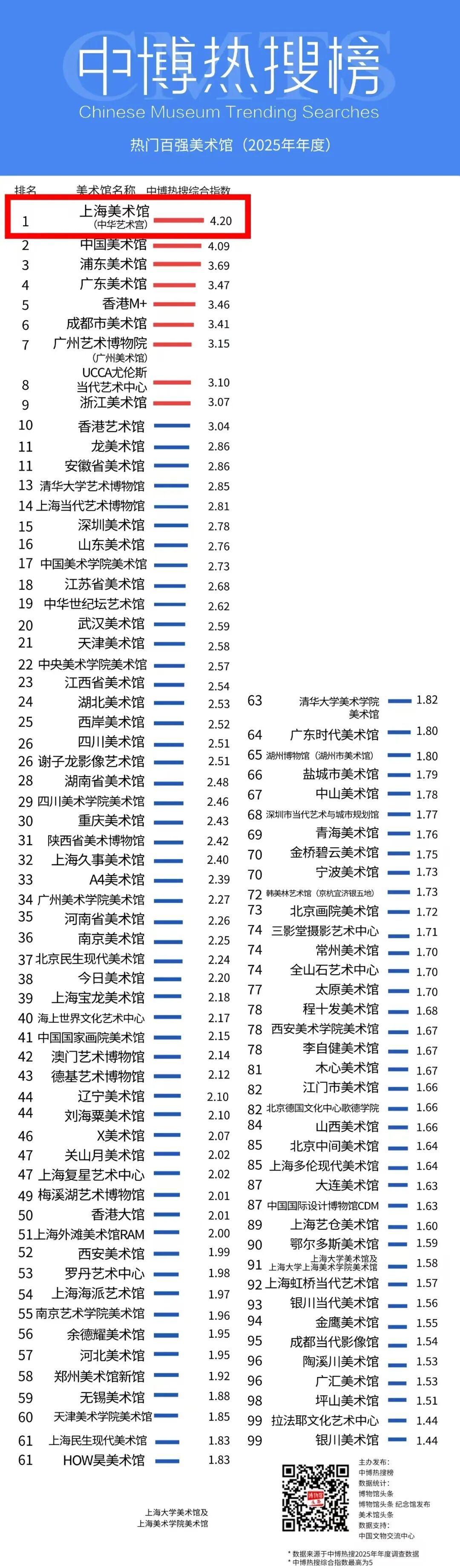 在由博物馆头条联合美术馆头条统计发布的「中博热搜榜」2025年热门美术馆及艺术博物馆年度榜单中,上海美术馆(中华艺术宫)荣登第一!