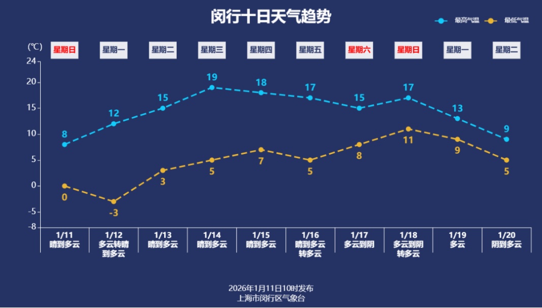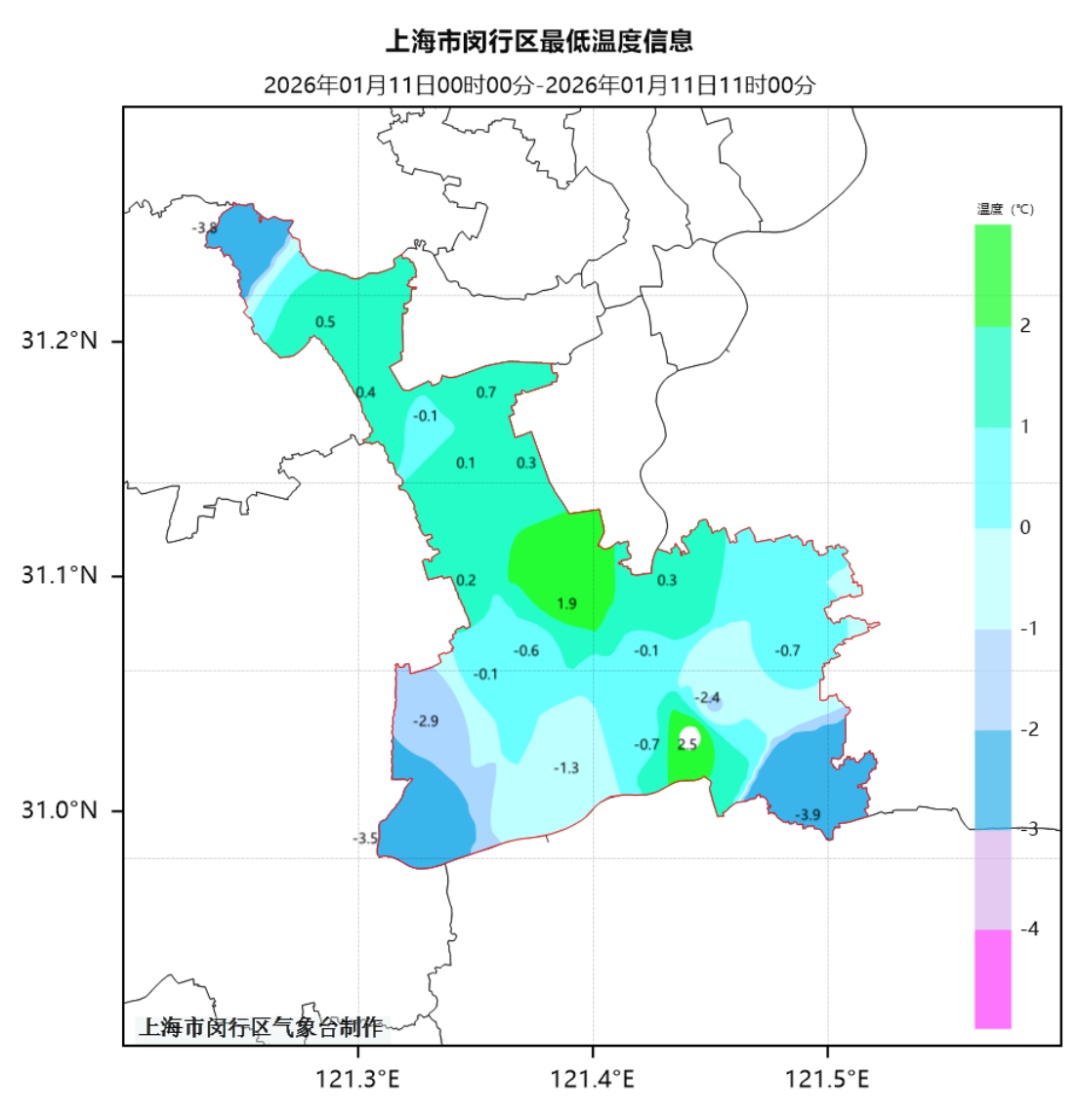 受冷空气和辐射降温影响,今天早晨本区气温较低,其中浦江镇零下3.9℃为最低,闵行本站为0.2℃。