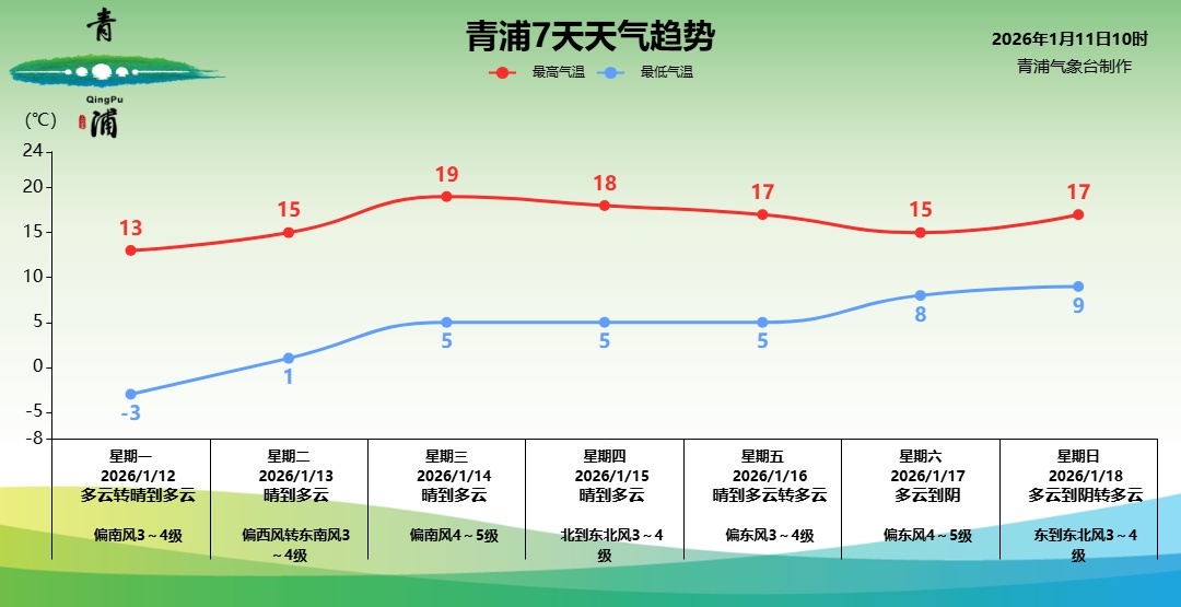 下周青浦区以晴或多云天气为主。明天叠加辐射降温的作用,早晨最低气温在零下5度至零下3度,有冰冻或严重冰冻,早晨出门大家衣服都裹紧了,白天最高气温13℃,暖阳相伴下,体感会舒服不少。周二起青浦区迎来一段“小阳春”,不仅最高气温会升至15-19℃,双休日连最低气温都在8-9℃,体感一下暖和不少。近期天气持续干燥,阳光在线,请大家注意用火用电安全,及时补水润燥。