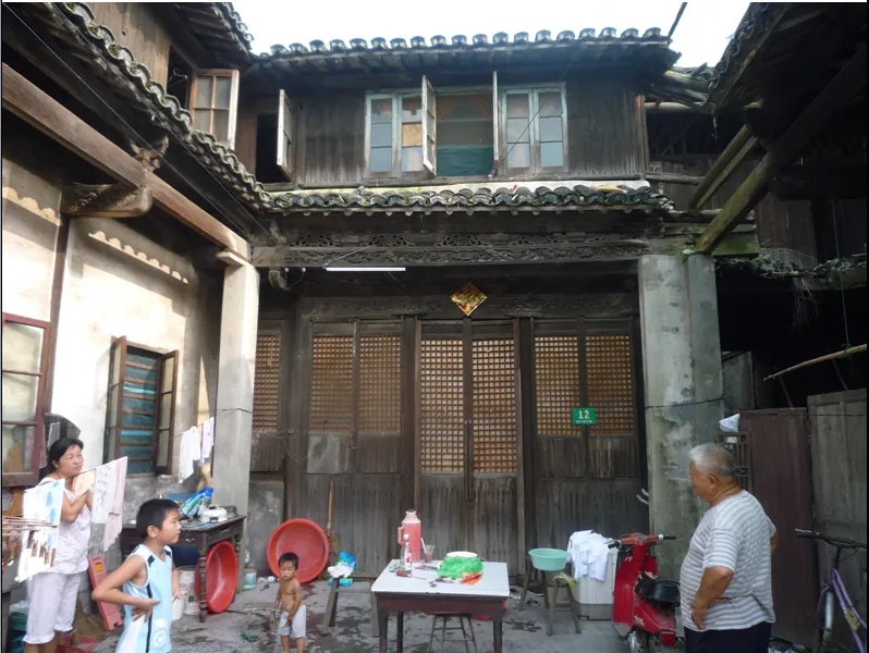 西街12号本是一座前后四进的宅院,如今仅存第四进正房与两厢构成的三合院,二层楼三开间,小巧紧凑,底层披檐与檐柱构成围绕天井的环廊,檐下花板精工雕琢,人物表情刻画细腻,正厅长窗的满天星格子门完好无损,是杜行老街现存最为精美的民居。