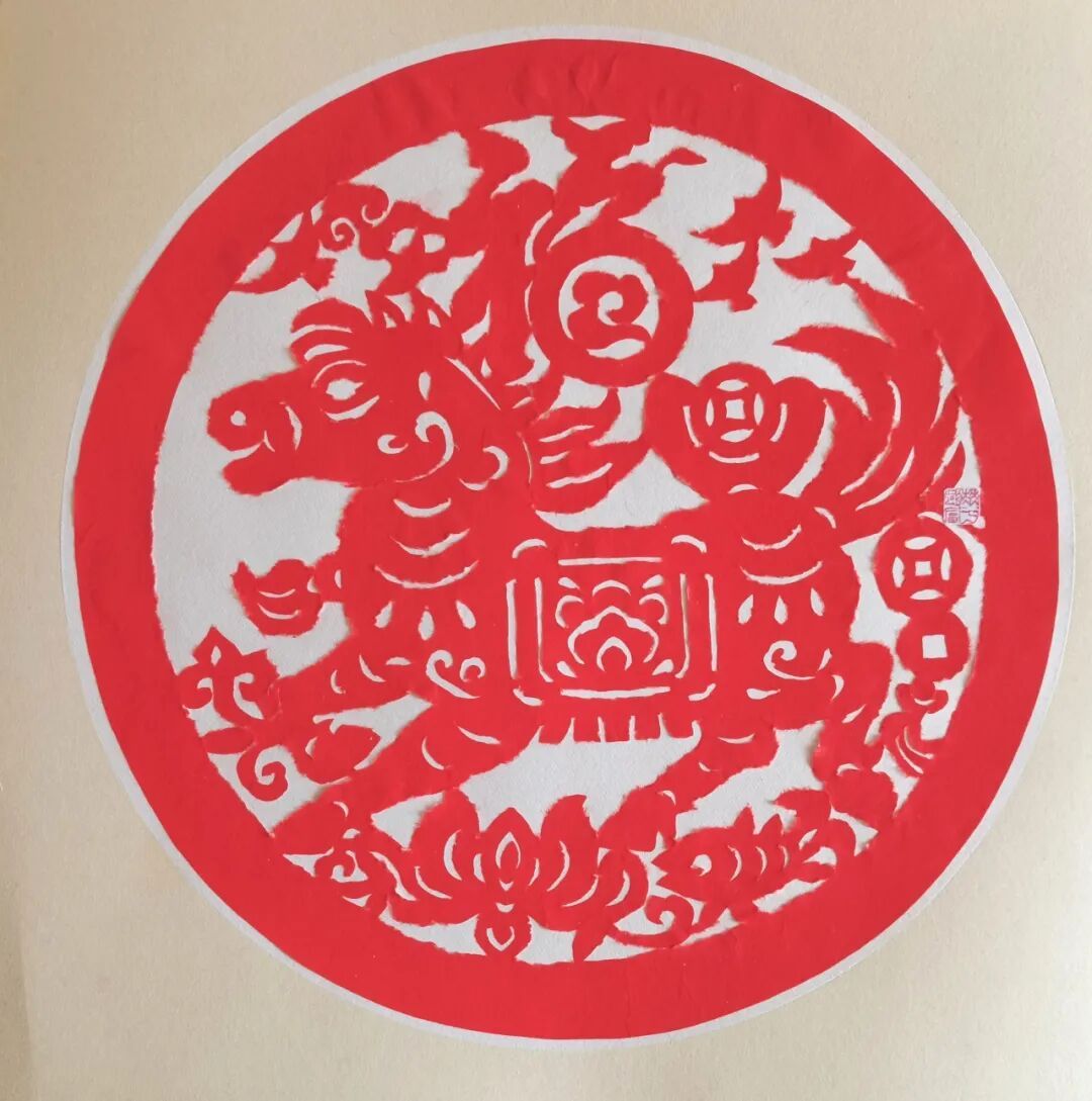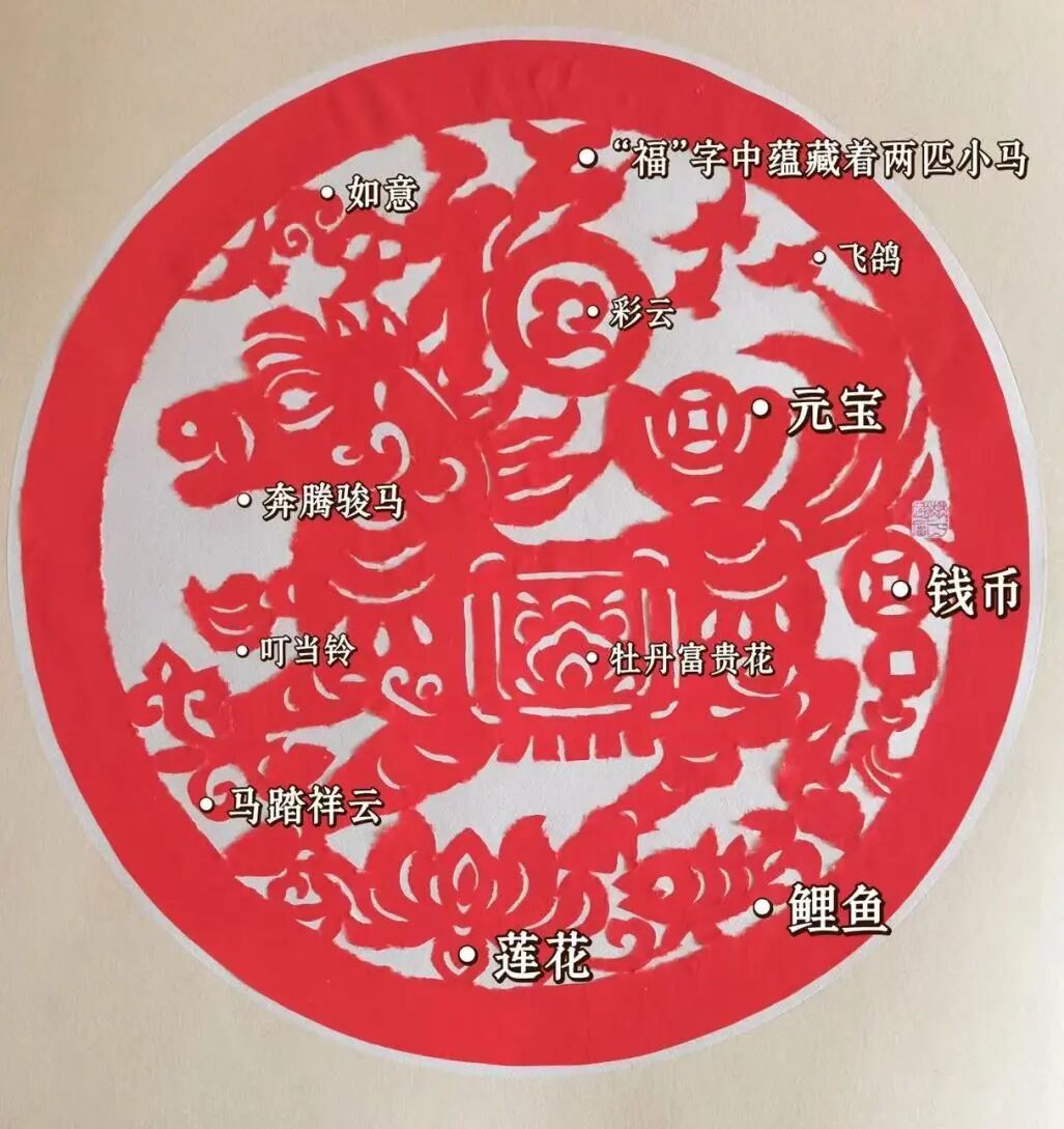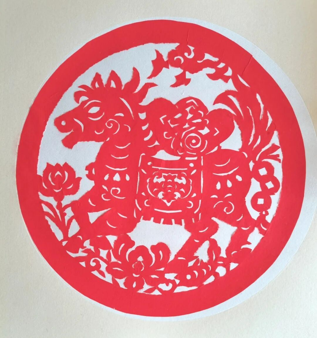 在这张完整的红纸上,骏马灵动鲜活,周身更融入了丰富的中国传统吉祥元素:彩云寓意祥瑞环绕,牡丹花承载富贵美满,飞鸽传递和平安详,元宝与钱币寄托着对日子蒸蒸日上的期盼,莲花象征做人清清白白,鲤鱼则含有“年年有余”的美好祝愿。