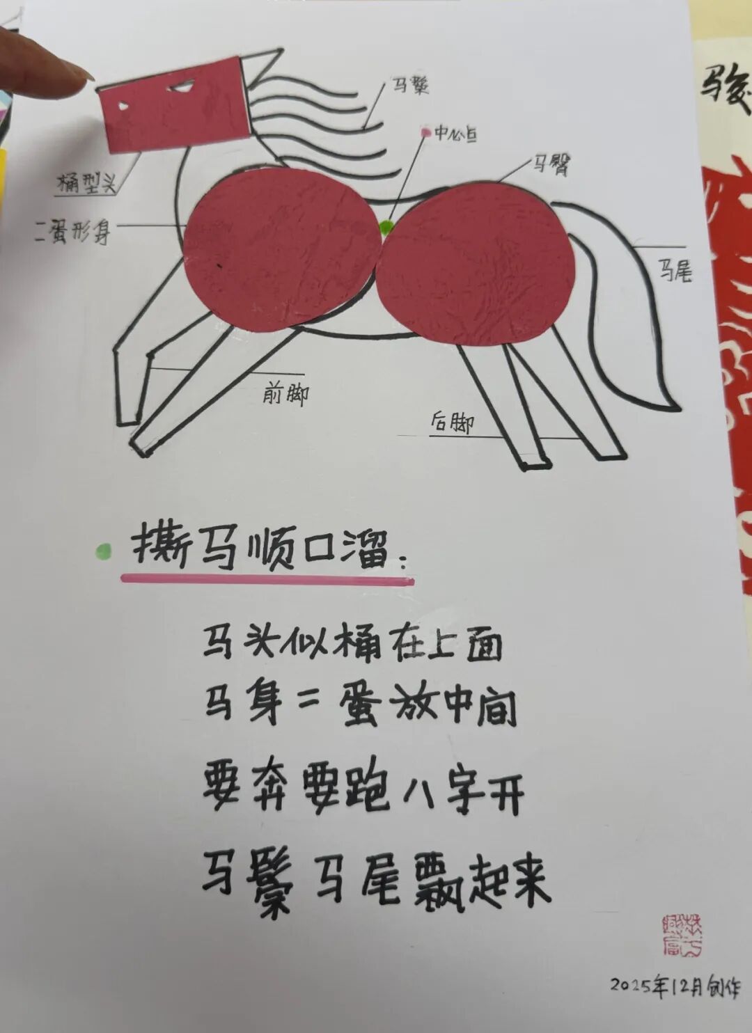 为了迎接丙午马年,华兴富从2025年4月便开始筹备。他反复推敲马匹的姿态细节,构思了数百张设计图。在漫长的创作过程中,他凝练出一套朗朗上口、便于传播的撕马口诀:“马头似桶在上面,马身二蛋放中间,要奔要跑八字开,马鬃马尾飘起来。”这句口诀,既是他创作经验的浓缩,也成为让零基础学员快速上手的“秘诀”。