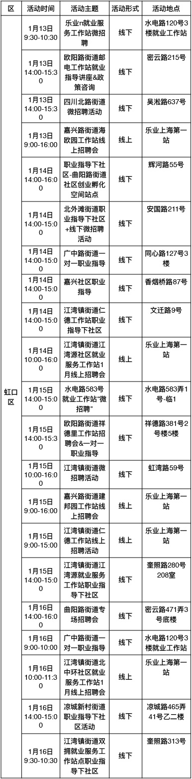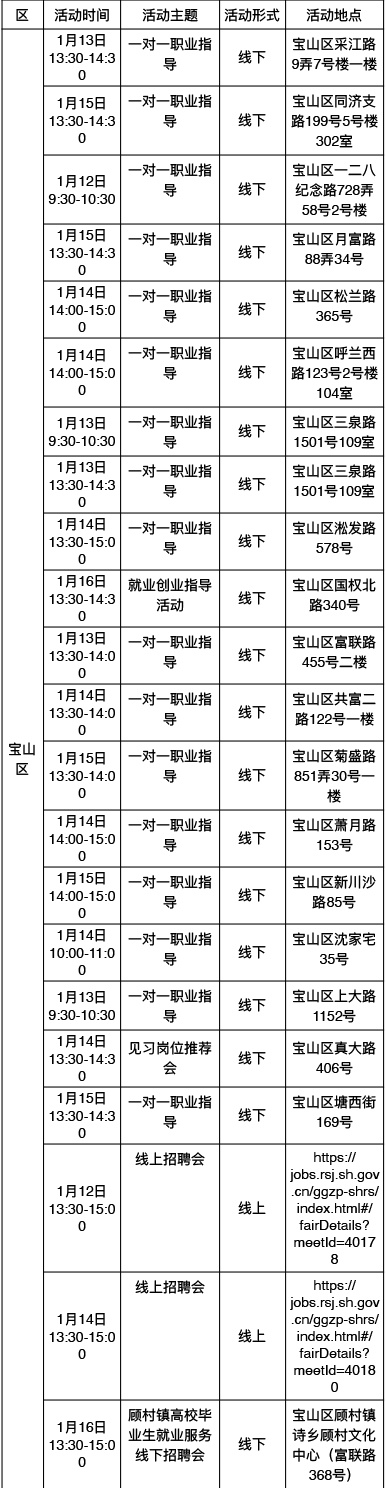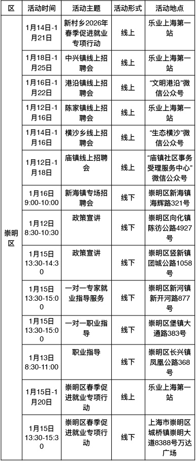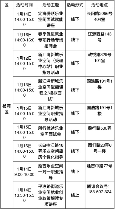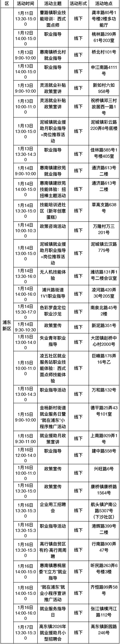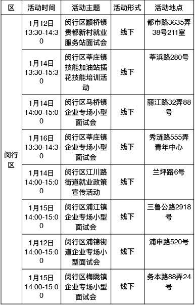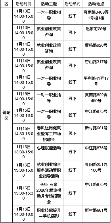 “乐业上海优+”行动持续进行中!为了更好地帮助大家拓宽就业机会,提供更优质的公共就业服务举措,全市将举办289场就业服务活动,普陀区最新活动排片表已出炉,等你来参加→ 以下信息仅供参考 具体以现场实际举办为准 “乐业上海优+”活动排片表 普陀区 奉贤区 浦东新区 静安区 宝山区 黄浦区 松江区 虹口区 长宁区 青浦区 崇明区 金山区 徐汇区 杨浦区 闵行区 嘉定区 点击下方了解更多 普陀全面排查消防安全隐患!全力筑牢社区安全“防火墙” 健康与文艺共舞,普陀这里的慢性病管理让晚年生活更有温度 持续推动产学研深度融合,普陀发布2026年网络安全产业首批应用场景需求 方寸之间见苍穹,普陀这所学校携手上海天文馆开启“仰望·星盒”微展览 英超电竞中国赛带动商场营业额环比增长30%!普陀“电竞+商业”模式显成效