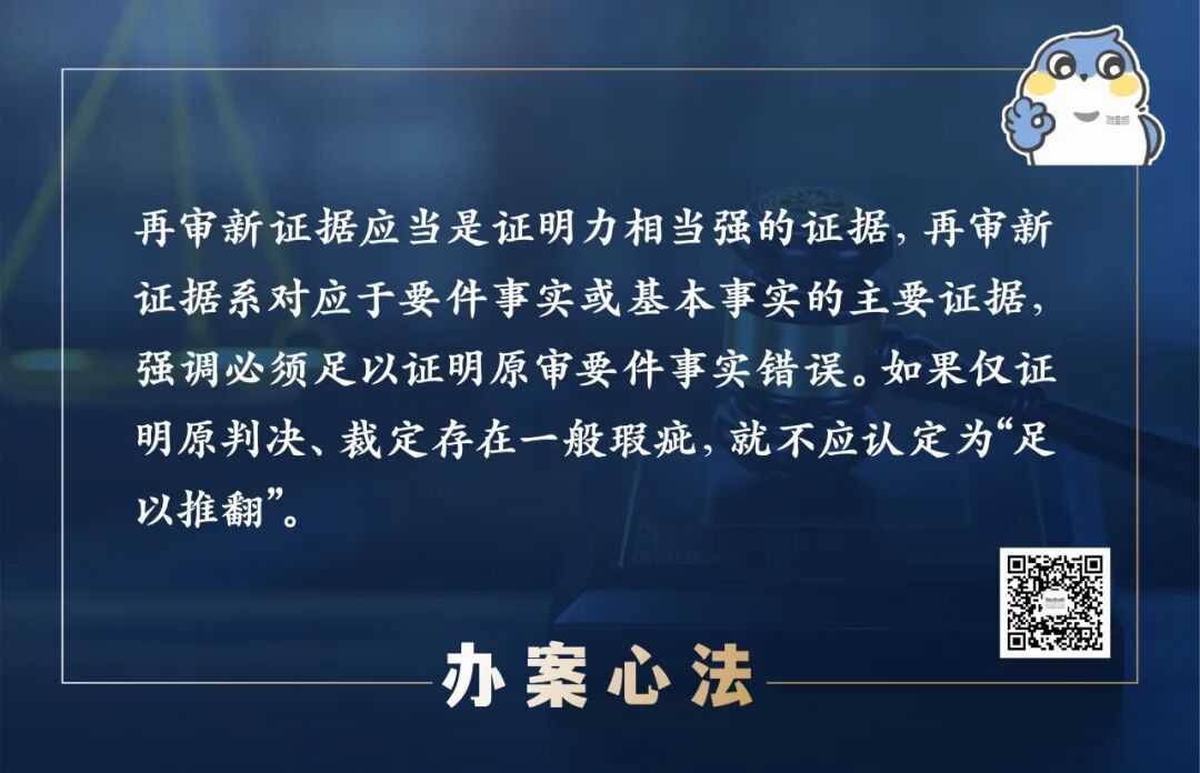 再审新证据应当是证明力相当强的证据,系对应要件事实或基本事实的主要证据,强调必须足以证明原审要件事实错误,对于证明力尚不足以动摇原生效裁判的证据,一般不具有再审新证据作用。要件事实是指对原判决、裁定的结果有实质性影响,用以确定当事人主体资格、案件性质、具体权利义务和民事责任等主要内容所依据的事实,即决定法律关系成立、变更、消灭或法律责任承担的核心事实。如果仅证明原判决、裁定存在一般瑕疵,就不应认定为“足以推翻”。