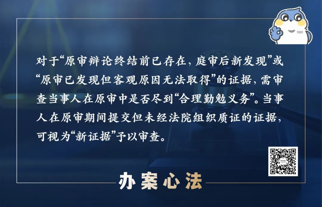 对于“原审辩论终结前已存在,庭审后新发现”或“原审已发现但因客观原因无法取得”的证据,需审查当事人在原审中是否尽到“合理勤勉义务”。实践中要强化举证责任,约束细化“新发现”认定标准:客观不能,如证据由第三方控制(如银行流水需金融机构配合);主观不能,如原审未申请调查令的视为怠于举证;特殊情形,如经法院释明仍未提交的视为放弃权利。因此,实践中证据由对方当事人掌控,原审中已申请法院调取但未获准许,庭审后通过律师调查取得的,可认定为“新取得”;但若证据由当事人自行保管,却以“忘记存放地点”为由逾期提交,合理性不足,难以认定为新证据。