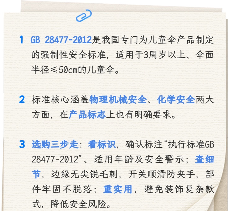 GB 28477-2012是我国专门为儿童伞产品制定的强制性安全标准,于2012年6月29日发布,并于次年5月1日正式实施。