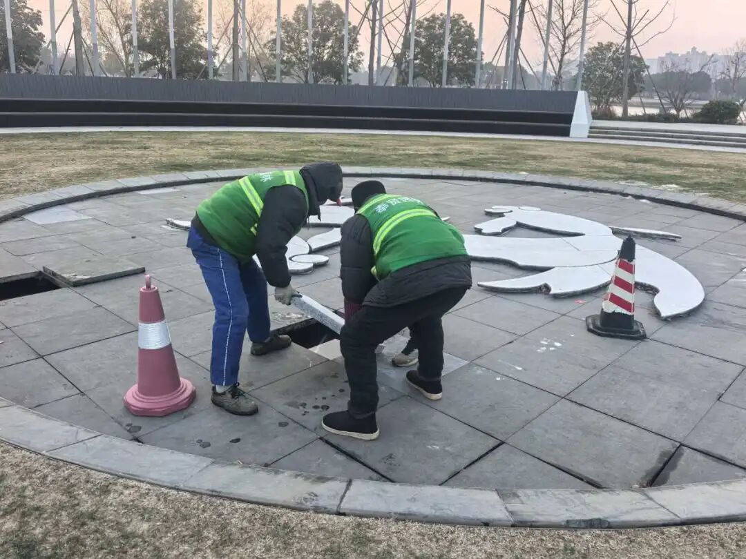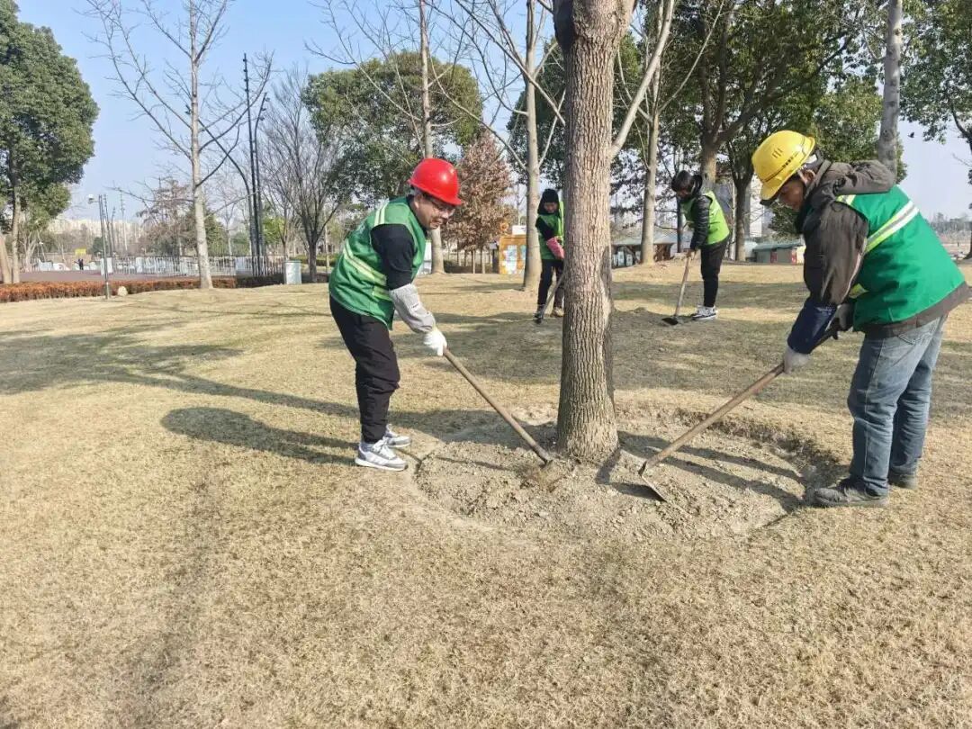 养护团队同步清理修剪枝叶、落叶等杂物,保障绿地整洁;抢抓关键节点为修剪后苗木浇灌冻水,提升抗寒能力,巩固养护效果。