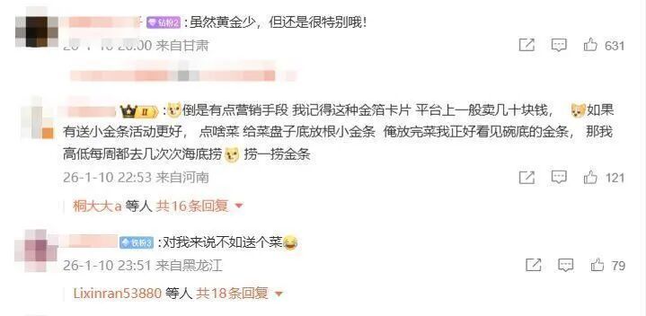 此事冲上热搜并引发了不少网友讨论,有网友表示:“不管黄金含量多少,顾客进去消费后还能让门店这么宠着,谁不爱呢。”“就餐时候的情绪价值也很重要。”也有网友则认为:“对我来说不如送个菜。”