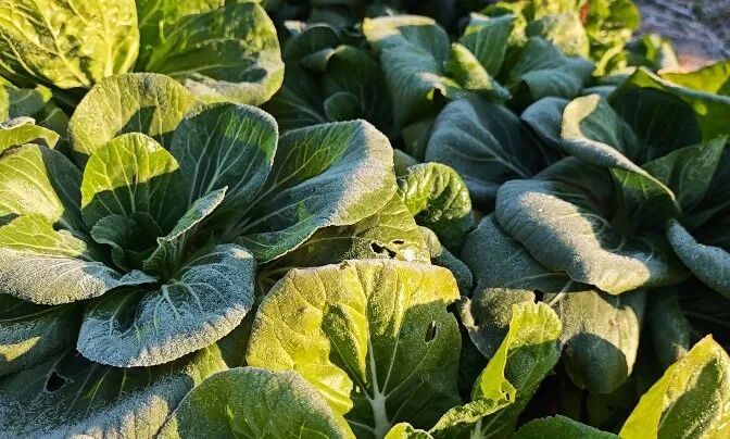 记者在徐行镇伏虎村的农田看到,寒霜为田野披上了一层银白“薄纱”。青菜、菠菜等叶菜表面凝结着晶莹的霜花,叶片边缘与脉络清晰突起,在晨光中闪烁着细碎的微光,宛如一件件精雕细琢的“水晶羽衣”。