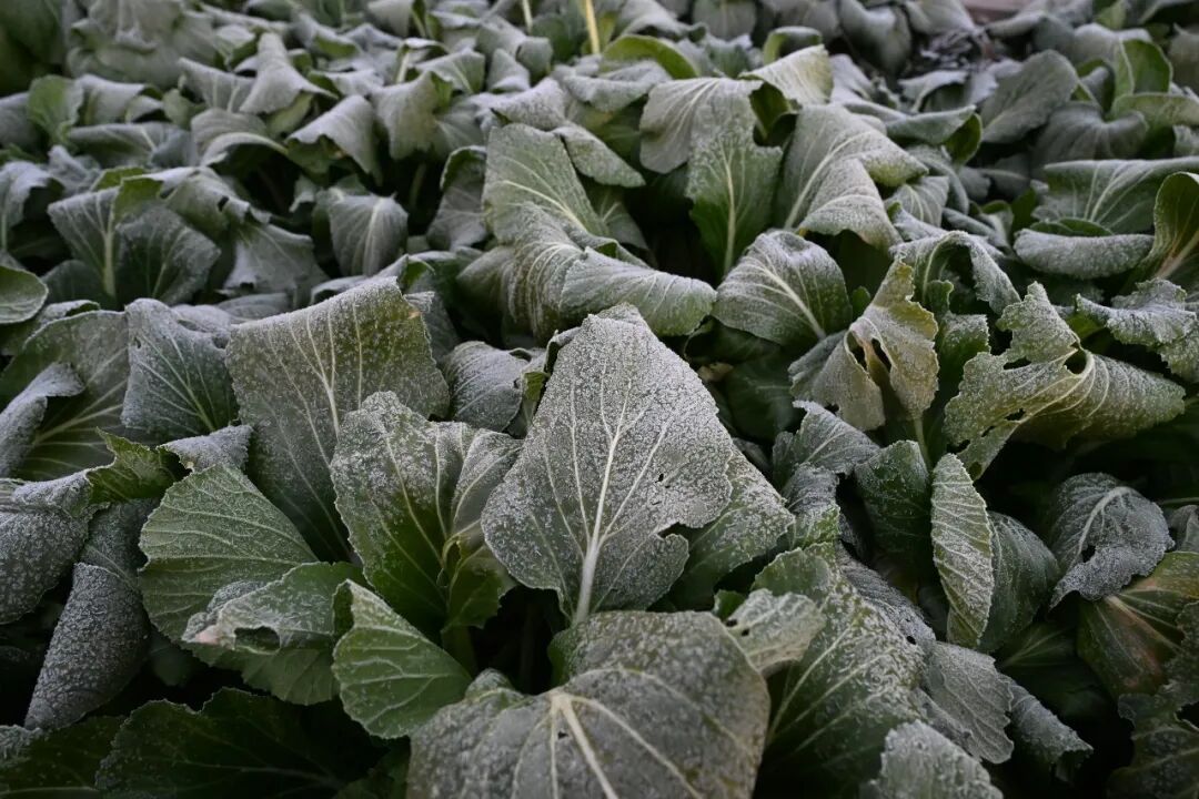 随着阳光逐渐洒满田地,霜开始消融。在嘉定工业区三里村的菜地里,覆盖在叶片上的霜层逐渐化为颗颗剔透的水珠,顺着叶尖缓缓滴落。上午8点半左右,随着气温回升,嘉定区气象台解除低温黄色预警和霜冻黄色预警信号。