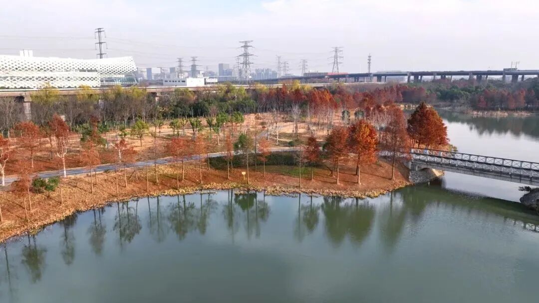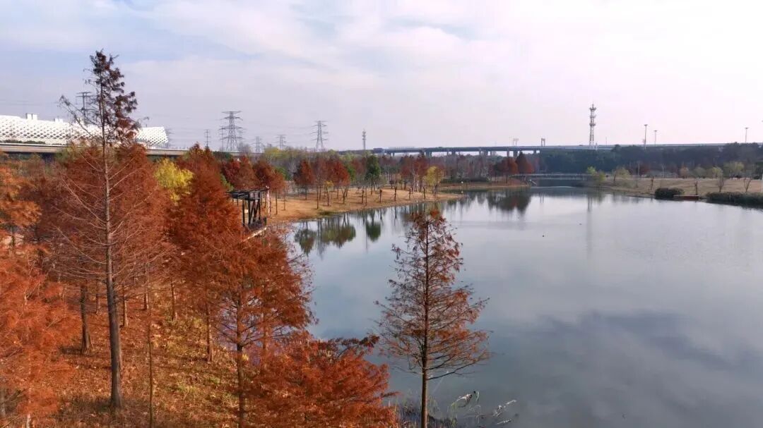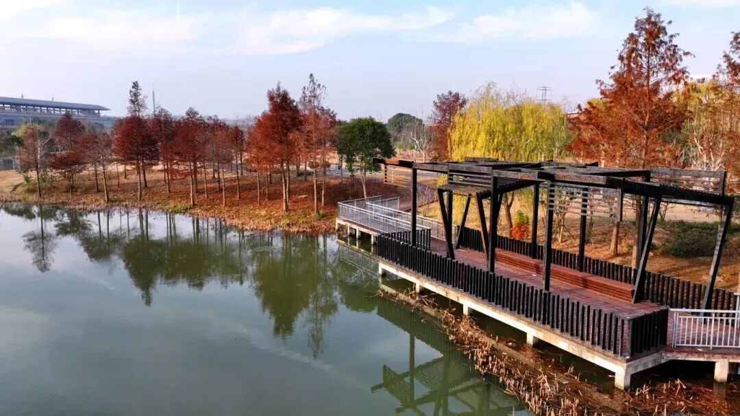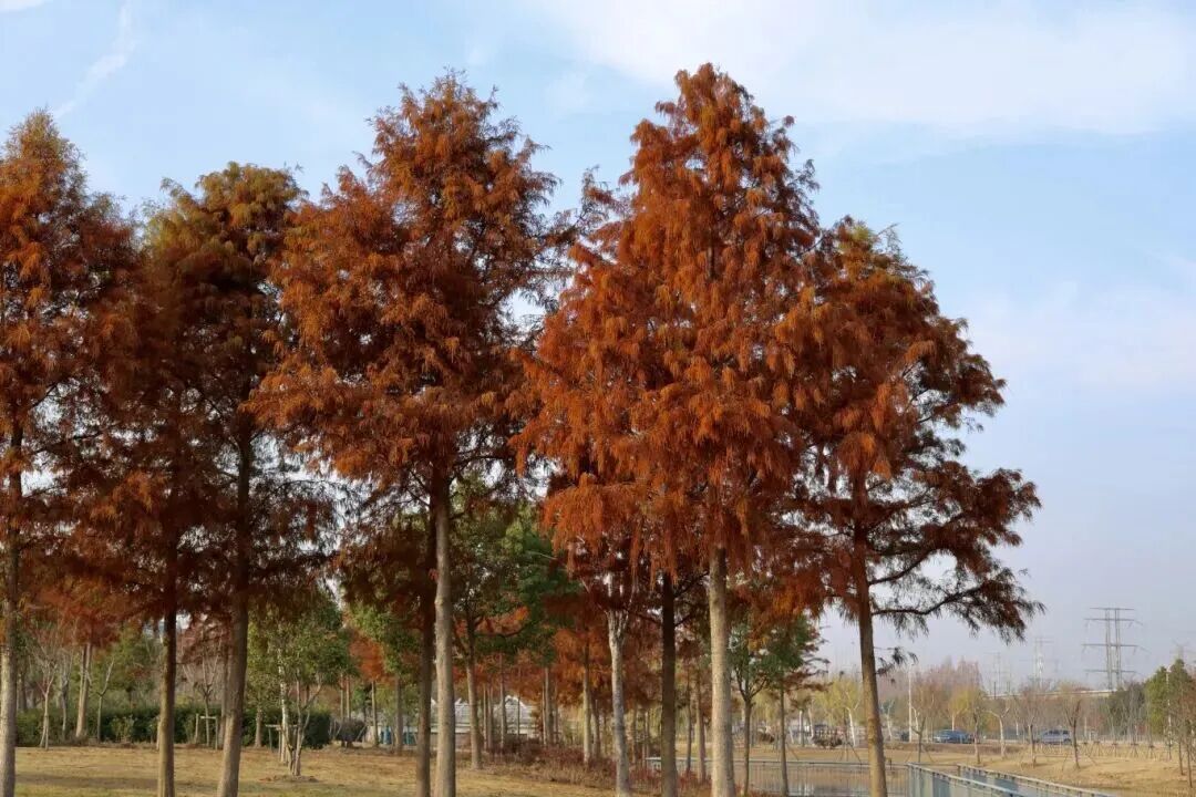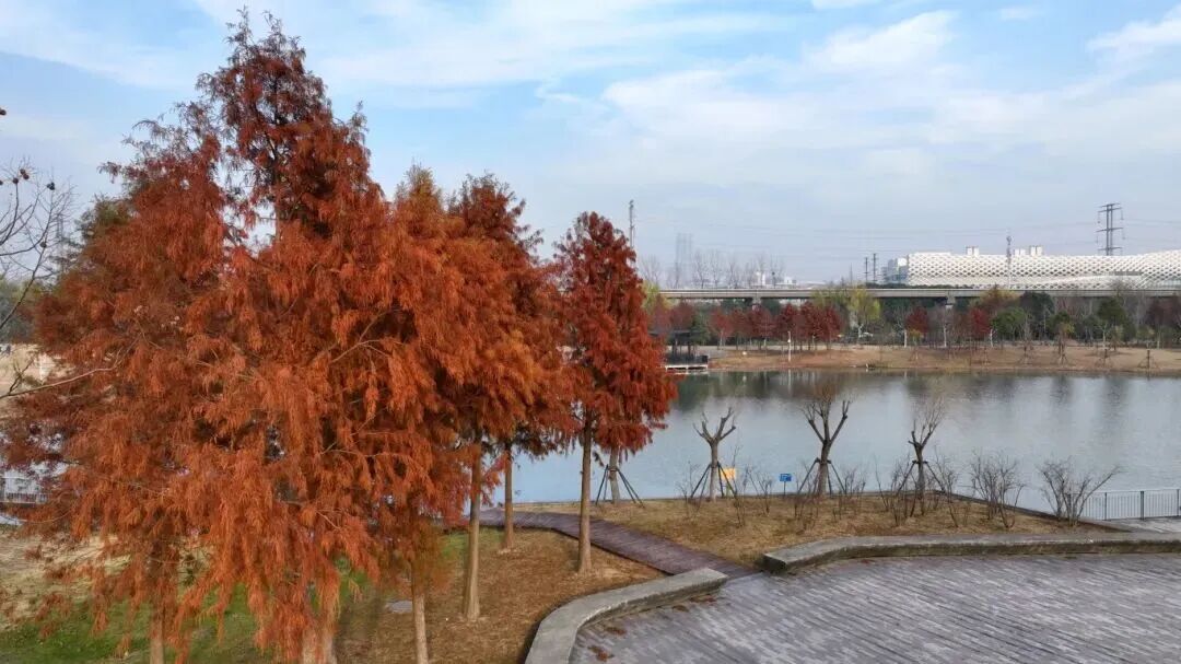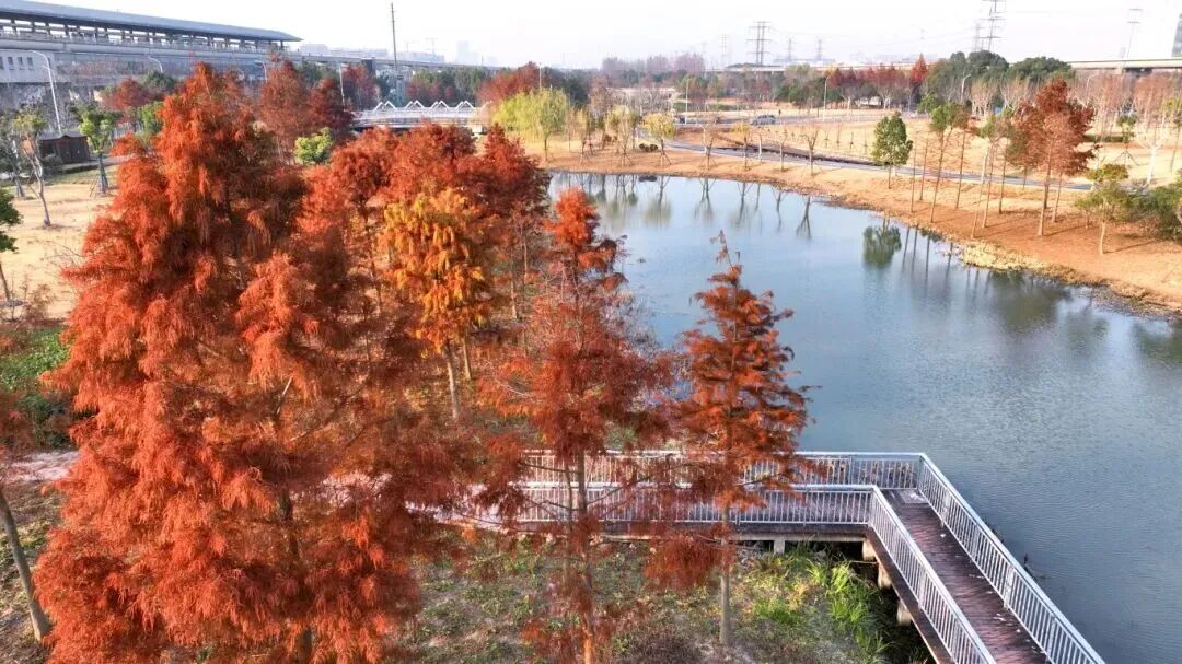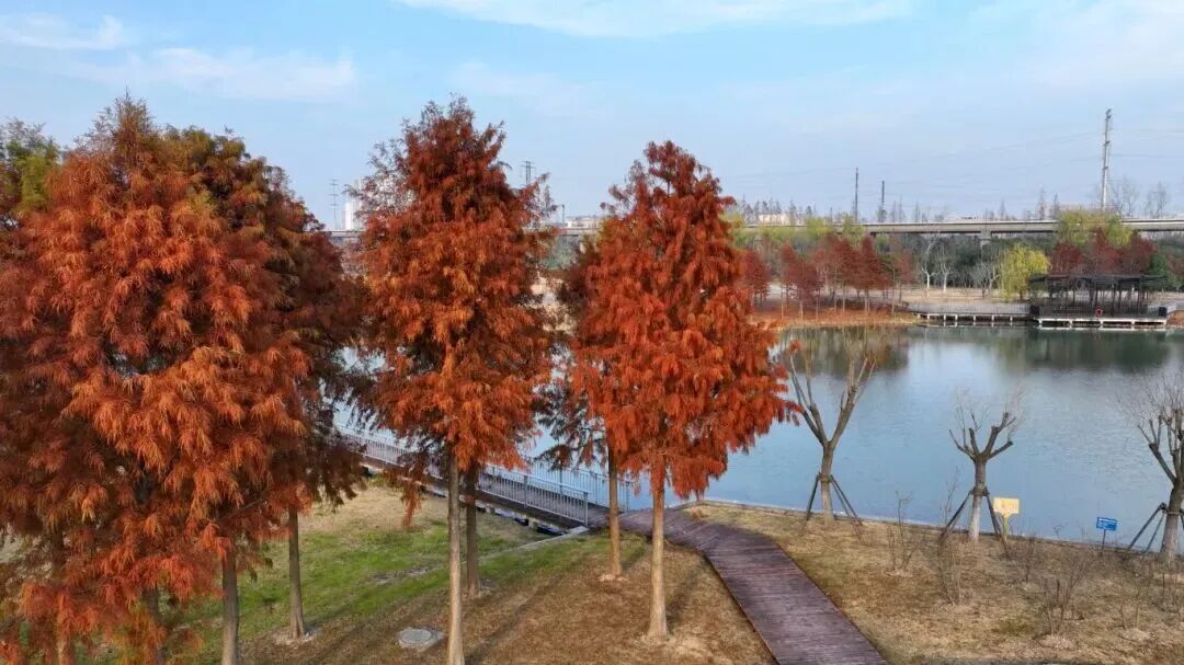 沿河岸整齐排布的水杉林,褪去盛夏苍翠,在暖阳轻抚下晕染出浅黄、橙红、深褐的细腻层次,成为这片绿地最动人的景致。