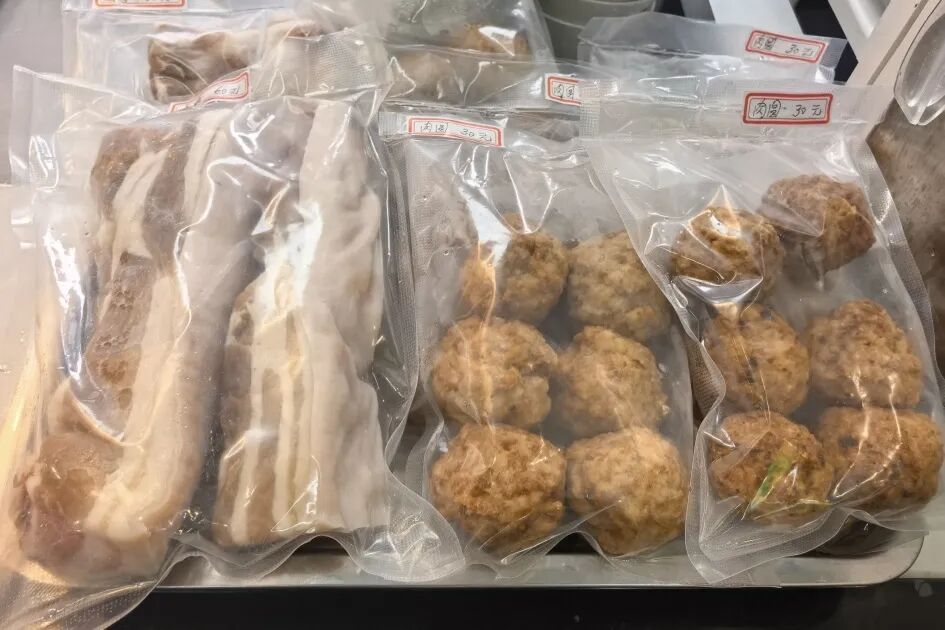 一袋袋手工肉圆、一块块自制咸肉被整齐码放在窗口,透着油润的光泽——食堂的“年货档”悄然开张啦!这并非批发来的商品,而是后厨老师傅们沿用老法子,亲手备下的传统“年味”。扎实的肉香与醇厚的咸香,抢先一步,在社区里漫开了过年的信号。