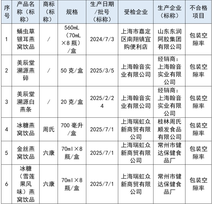 近期,上海市市场监督管理局对本市流通领域(含电商平台)的滋补品开展了商品包装物减量(过度包装)监督抽查,共抽样并完成检验70批次,其中合格64批次,6批次涉嫌不合格,不合格发现率8.6%。