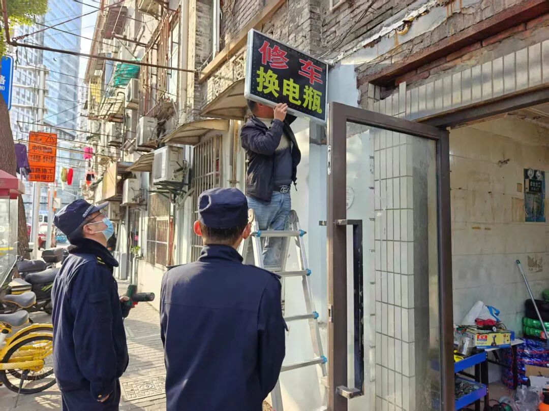 针对沿街新开某商铺违规悬挂招牌的问题,执法队在日常巡查中第一时间发现并上门处置。现场,执法队员向商户明确违规设置户外招牌的相关规定,指出未经审批、固定不达标招牌在寒潮大风天气下存在的坠落风险,同步指导商户按照规范流程办理招牌设置手续。