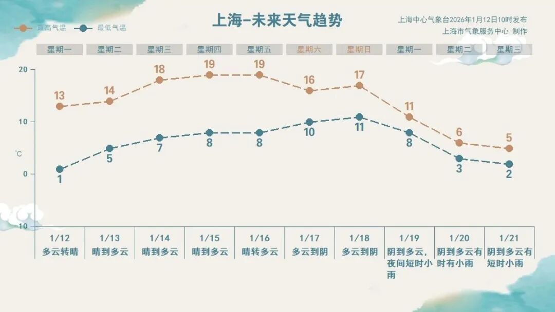 上海中心气象台预计,本周最高气温在19℃到20℃,妥妥的“小阳春”体感,但昼夜温差较大。值得注意的是,1月中旬出现这样的温暖天气,在历史上并不常见。据了解,徐家汇站自1872年有记录以来,仅有约10个年份在1月中旬出现过20℃以上的气温,极端最高为1908年的23.3℃。最暖的1月中旬出现在2002年,曾连续5天最高气温超过17℃。